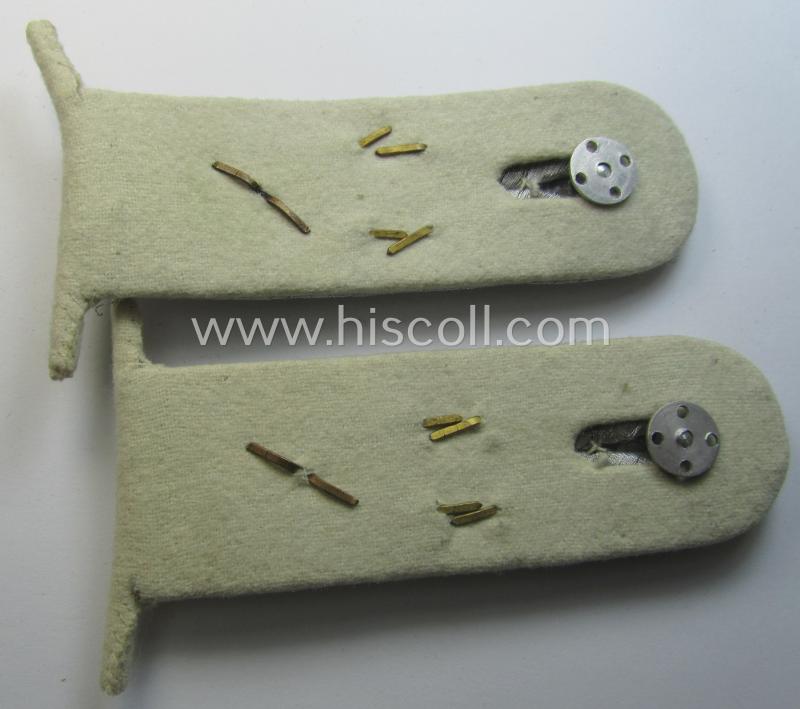 This is an attractive - and/or fully matching! - WH (Heeres), neatly 'cyphered', officers'-type shoulderboard-pair (that comes mounted on its unsually seen: 'Auf der Steg'-mounting!) and that is piped in the neat white- (ie. 'weisser'-) coloured branchcolour as was specifically intended for usage by an: 'Oberleutnant des Infanterie-Regiments 91' (or: army lieutnant first-class who served within the infantry regiment, numbered: '91') and that comes in an overall very nice- (and I deem just moderately used ie. worn- and/or clearly tunic-removed-), condition. The shoulderboards come mounted on their seldomly seen 'Auf der Steg'-set-up ie. mounting and where most likely used onto a white-coloured- (or: summer-type-) tunic. They are truly 'text-book'-examples of the 'Heeres'-type 'Infanterie'-shoulderboards and have the bright-silver- (ie. somewhat shiny-) 'upperdecks'. The boards show the white- (ie. 'weisser'-) coloured branchcolour (and are constructed from the smooth- ie. 'moleskin'-type wool). The pair - that was recently found at a German private-household - shows a fully matching set of (neatly bright-golden-toned, larger-sized ie. older-styled and/or identical) '9'- and/or: '9'-numerals (ie. 'Ziffern') and a pair of (equally-styled) pips period-attached (as can be noticed on the pictures). All six devices are just minimally stained- ie. tarnished but have preserved a fine and fairly bright- (and/or quite shiny!) age-patina. The boards measure approximately 11 cms. in length each and came with a neat pair of silver-toned 'Schraubknöpfe' attached. The pair was most certainly used and/or worn as such and does show some minimal age, wear and/or staining (no damage on both 'Auf der Steg'-mountings is present (the boards are of course fully functional and can easily serve to complete any tunic). Simply an attractive - and comparatively scarcely encountered! - officers'-type, 'Infanterie'-related shoulderboard-pair that belonged to an: 'Oberleutnant des Infanterie-Regiments 91'!