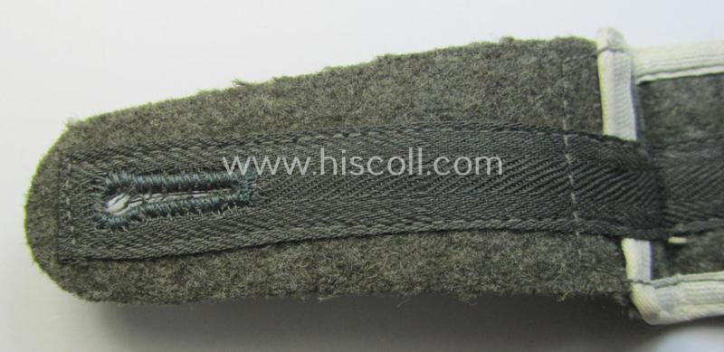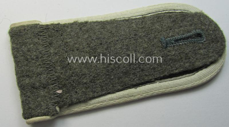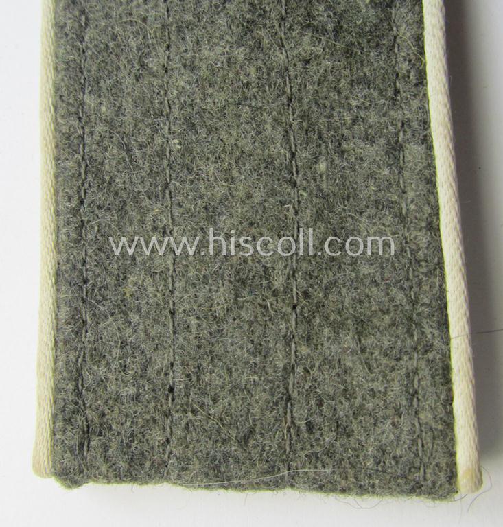 The attractive - and with certainty not that easily found! - WH (Heeres) enlisted-mens'-type shoulderstrap shows the desirable white- (ie. 'weisser'-) coloured and/or: typical 'silk-like'-type piping attached and measures approximately 10,5 cms. in length and is clearly of the simplified. so-called: 'last-ditch'- (ie. 'M44'-) pattern. The shoulderstrap is constructed from the (typical) field-grey-toned, later-war-type wool and comes naturally mounted onto its functional tongue (as can be noticed on the pictures). The strap just shows some minimal age ie. wear and was clearly used and/or worn as such. It should be noted that these white-piped- (thus 'Infanterie'-related) and/or later-war period- (ie. 'simplified'- ie. 'M44'-pattern-) enlisted-mens'-type shoulderstraps are quite desirable and can easily be graded 'scarce' even more so when they come in such a nicely preserved condition as the strap on offer here!
