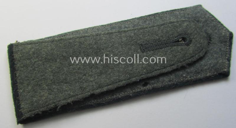 This is an attractive - albeit regrettably single! - WH (Heeres), early- (ie. pre-war-) period, so-called: 'M36-/M40'-pattern- (pointed-styled) 'cyphered'- and/or per regulation non-piped enlisted-mens'-type shoulderstrap as was intended for - and worn by! - a: 'Soldat des Artillerie-Regiments 114' (or: simple soldier who served within the army artillerie-unit ie. regiment, numbered: '114') and that comes in an overall very nice- (albeit moderately used ie. worn-), condition. The shoulderstrap - which is approximately 12,4 cms. sized in length - has the 'standard-type'- and/or darker-green-coloured, smooth-woolen-based 'upperdeck' and has (of course) no piping attached. The strap shows the neat (machine-embroidered by means of so-called: 'Kurbelstickerei'-) so-called: double '1'- and/or: '4' cyphers ie. numerals. These 'cyphers' are executed in the bright-red- (ie. 'hochroter'-) coloured wool ie. linnen as to be expected (as can be seen on the pictures). The strap - which comes mounted onto its original tongue - shows as stated above just minimal usage and/or wear and is just minimally stained. It should be noted that all 'cyphered'-pattern shoulderstraps can easily be regarded 'fairly scarce'. Simply an attractive and/or: early-war-period, neatly 'cyphered' and/or 'Heeres'-related EM-type shoulderstrap that was intended for usage by a: 'Soldat des Artillerie-Regiments 114'!