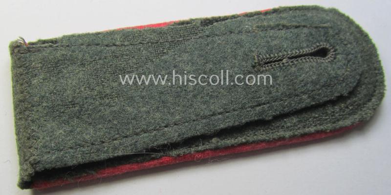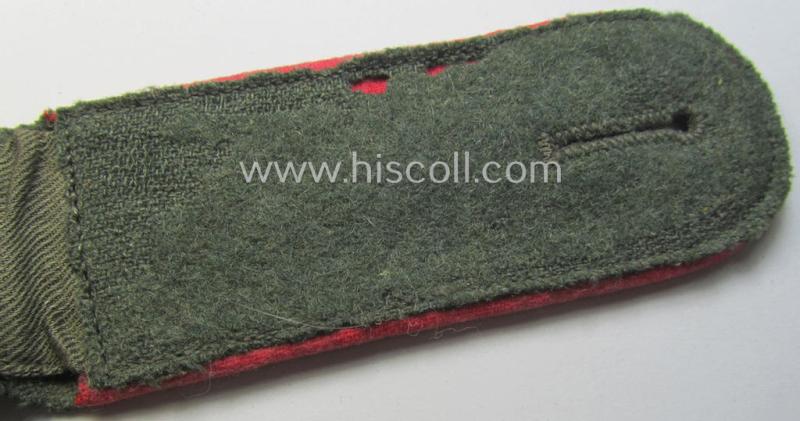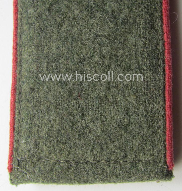 This is an attractive - albeit regrettably single but nevertheless scarcely seen! - (I deem) early- (ie. mid-war-) period, so-called: 'M40 o. M43'-pattern, WH (Heeres) enlisted-mens'-type shoulderstrap as was piped in the bright-pink- (ie. 'rosaroter'-) coloured branchcolour as was intended for a: 'Soldat u. Mitglied eines Panzer- o. Panzerjäger-Abteilungs o. Regiments' (or simple soldier who served witin a tank-destroyer- ie anti-tank unit ie. regiment) and that comes in an overall nice- (I deem clearly issued- and/or: just moderately used- ie. worn-), condition. The shoulderstrap - which measures approximately 11,5 cms. in length as more often seen - has the woolen-type piping attached (as is more encountered with these early- (ie. mid-war-) period shoulderstraps). The shoulderstrap - which originates from a larger cloth- and insignia-collection I recently acquired for the web-site - comes mounted onto its functional tongue (as can be noticed on the pictures). Simply an attractive - and/or fully 'text-book'! - 'M40- o. M43'-pattern, EM-type 'Panzer o. Panzerjäger'-related shoulderstrap that was intended for usage by a: 'Soldat u. Mitglied eines Panzer- o. Panzerjäger-Abteilungs o. Regiments'!