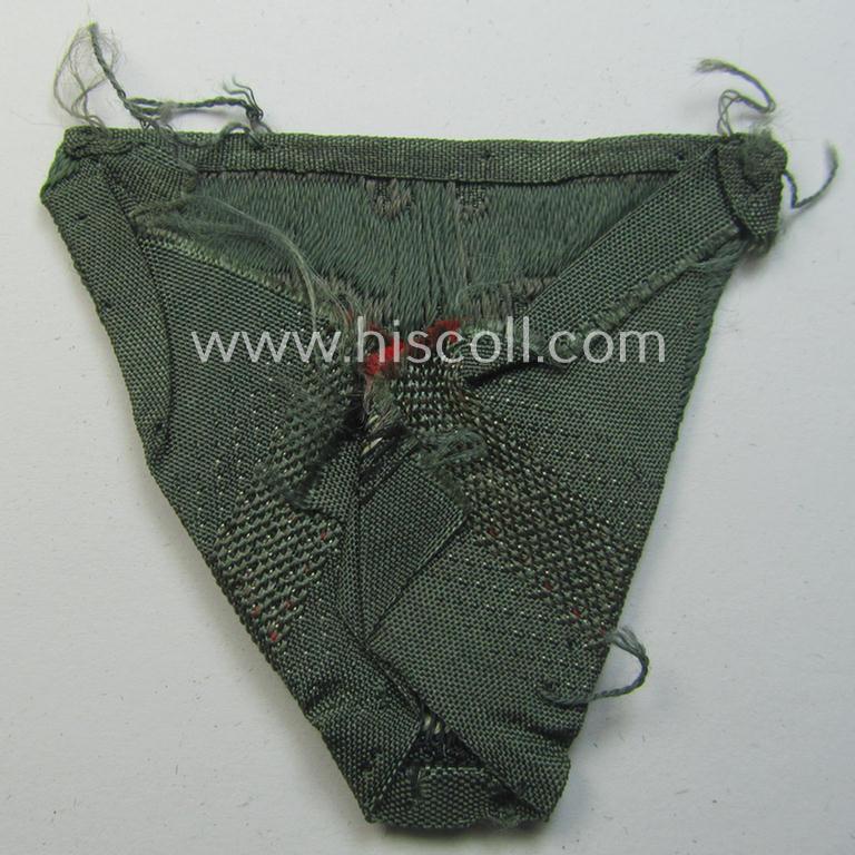 This is a neat - and I deem used and/or carefully cap-removed! - example of the 'standard-issue'-type, WH (Heeres) so-called: 'M43-pattern'-cap-eagle/cocarde (ie. cap-trapezoid) as was specifically produced for usage on the so-called: 'M-43'-model field-caps (ie. 'Einheitsfeldmützen') and that comes in a just minimally used- (ie. I deem once cap-attached-), condition. The piece is executed in the so-called: 'BeVo'-weave-pattern and was nicely confectioned ie. prefolded and/or once cap-attached and comes as recently found. The piece - that was once cap-attached by means of hand-stitching - is executed in bluish-grey-coloured linnen on a field-grey-coloured (and/or also linnen-based) background and does show some minimal age, wear and/or staining ie. storage-age (as can be seen on the pictures). Simply a neat occasion to aquire an attractive, truly worn and 'BeVo'-woven cap-trapezoid for a competitive price!