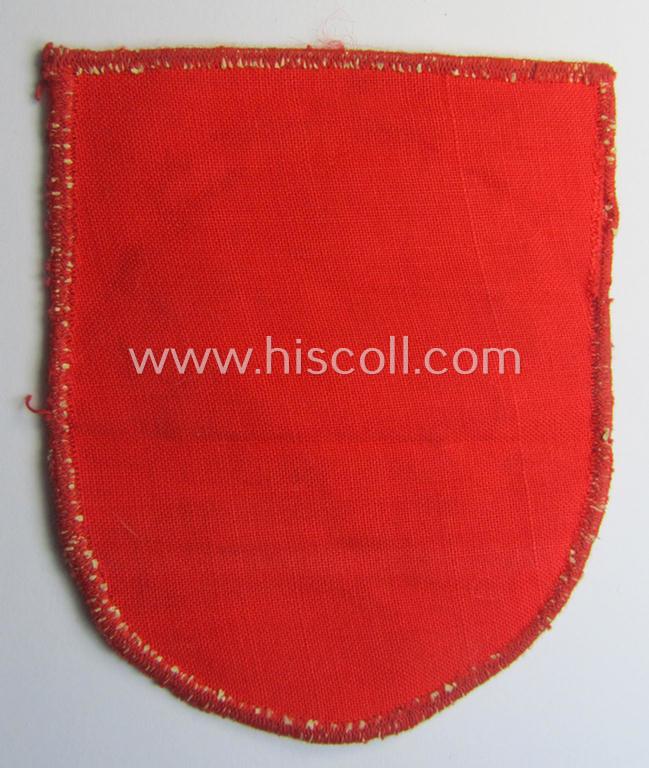 This is an attractive - and actually scarcely encountered! - D.A.F.- (ie. 'Deutsches Arbeitsfront') specialist-armbadge (ie. 'Tätigkeitsabzeichen') is executed in the neat 'BeVo'-weave pattern and was specifically intended for usage by an: 'Übungswart' (being some sort of instructor- ie. trainer) and that comes in an overall very nice- (albeit minimally used- ie. worn- and/or: I deem clearly tunic-removed-) condition. The badge on offer here - showing a swastika-sign surrounded by the (typical) D.A.F. 'Zahnrad'-sign ie. logo with below that the text: 'Übungswart' - is beautifully executed in so-called 'BeVo'-weave pattern and is backed with: bright-red-coloured- (and/or: linnen-based-) cloth (as can be seen on the pictures). The badge - which measures 9,5 x 8,5 cms. - is just minimally worn and shows some normal wear, age and/or staining. Simply an attractive and most certainly scarcely encountered D.A.F.-related arm-badge ie. 'Tätigkeitsabzeichen' that is accordingly priced!