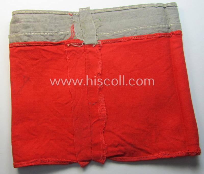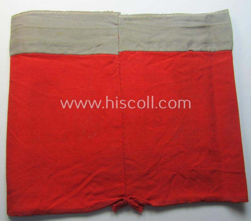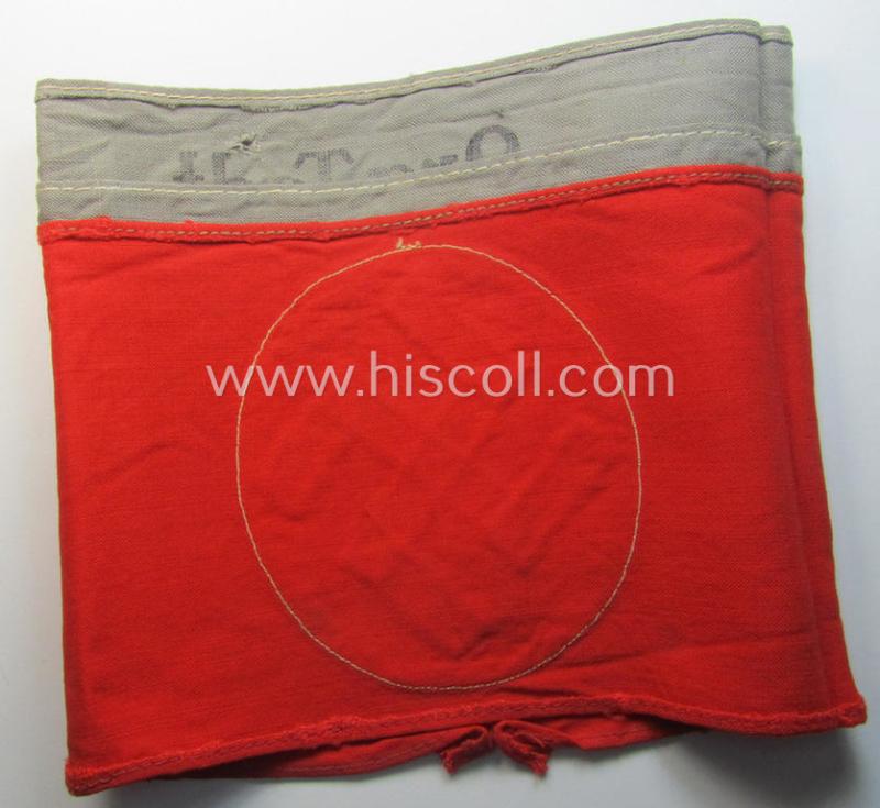 This is an attractive - and with certainty rarely found! - (I deem) early-war-pattern example of an: OT (ie.: 'Organisation Todt') enlisted-mens'- (ie. NCO-) pattern cuff-title (ie. 'Ärmelband für Mannschaften u. Unteroffiziere der Organisation Todt) that shows the combination of a (period-assembled!) linnen-based swastika- and dito 'Org.Todt'-cuff-title and that comes in an overall very nice- (and as stated just moderately used- and/or most certainly tunic-removed-), condition. The armband - which is as stated above comprising of two cuff-titles - comes in a full-length condition and comes of-factory sewn-together and measures approximately 34 x 14 cms.: it is just a tiny bit stained and is somewhat wrinkled (can be seen on the pictures). Simply an attractive - and actually rarely found! - TR-era, EM- (ie. NCO- )type- and early-pattern: 'Org.Todt'-cuff-title that will be very hard to be upgraded!