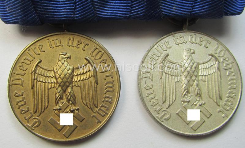 2-pieced medal-bar (ie. 'Spange') showing two: WH (Heeres o. Kriegsmarine) so-called: 'Dienstauszeichnungen für 4 u. 12 Jahre Treue Dienste' that both come period-mounted as a so-called: 'Doppelspange'