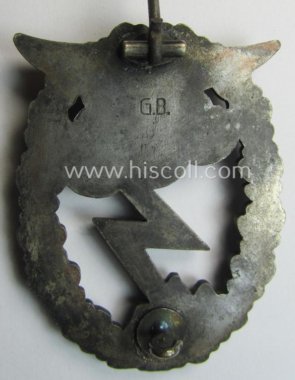 Mid- (ie. later-war-) period, zinc- (ie. 'Feinzink'-) based version of a WH (Luftwaffe) 'Erdkampfabzeichen' having a separate eagle-device attached and being a maker- (ie. 'G.B.' or 'Gustav Brehmer'-) marked example