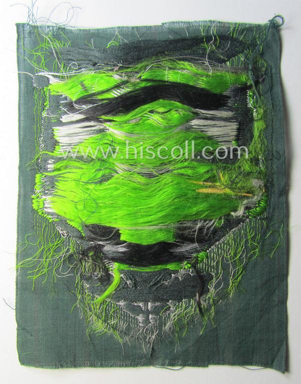 This is a truly very attractive - and in this particular branchcolour truly rarely encountered! - WH (Heeres), flat-wire- (ie. 'BeVo'-) woven so-called: 'Ärmelabzeichen für Fahnenträger' (or: flag-bearers' arm-badge) as was piped in the neat bright-green- (ie. 'hellgrüner'-) branchcolour as was intended for a soldier (ie. NCO) who served within an army: 'Panzer-Grenadier-Regiments' (ie. infantry-related, rifle-regiment) and that comes is a very nice- (ie. 'virtualy mint- ie. unissued'-), condition. The arm-badge is very nicely woven in the so-called: 'flat-wire', 'BeVo'-woven technique and is truly a superb example of this fantastic technique. The badge comes in a totally unconfectioned- ie. 'virtually mint' condition and simply cannot be upgraded. It should be noted that these bright-green-piped arm-patches rank amongst the most desirable and rarely encountered examples of the colourful series and I deem that I have priced this rare example accordingly: I have seen similar examples being offered for much more than my asking-price!