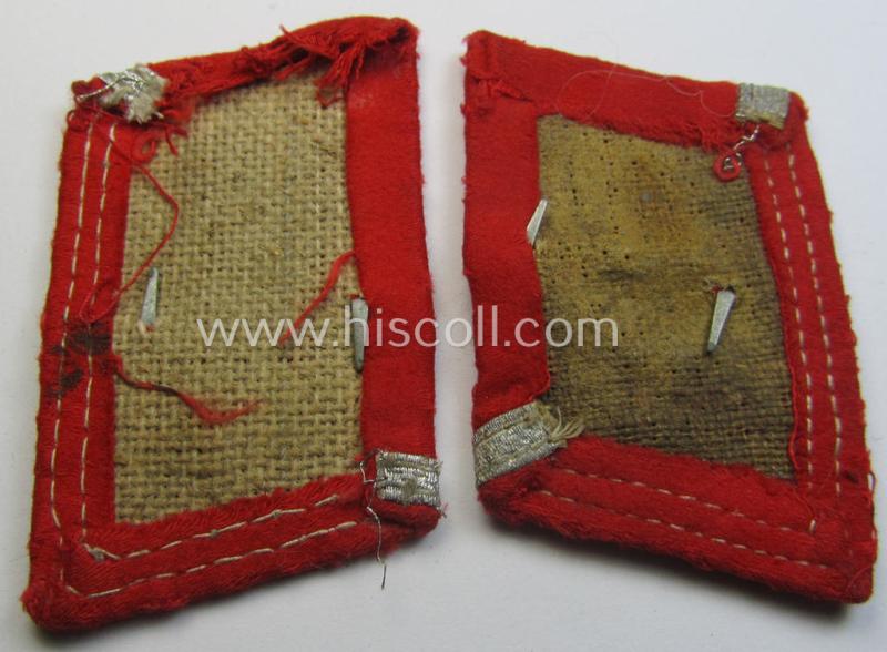 The neat - albeit truly used- ie. worn! - WH (Luftwaffe) enlisted-mens'- (ie. NCO-type-) collar-tab pair is piped in the neat bright-red- (ie. 'hochroter'-) coloured branchcolour and is of the model that was specifically intended for usage on the great-coat (ie. 'Mantel'). The collar-patches are both executed in the bright-red- (ie. 'hochroter'-) coloured, 'smooth-type' (ie. 'moleskin'-type) wool and were as such intended for usage by a: 'Soldat der Flakartillerie-Truppen'. They are as stated of the specific model solely intended for use on the greatcoat (ie. 'Mantel'): they can easily be recognised as such by means of the supplementary-attached, thin-shaped, LW-type and/or silver-coloured 'braid' that is 'off-factory'-attached (as can be noticed on the pictures). The patches - which have the beige-reddish- toned and buckram-based 'backing' as to be expected - are were with certainty once great-coat attached: they each show a single (zinc-based) wing (ie. gull or 'Schwinge') attached and do shows some minimal age, wear and/or staining (as can be seen on the photos). It should be noted that these tabs can easily be graded 'scarce'!