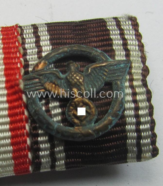 The neat - and not that easily found! - three-pieced, WH (ie. N.S.D.A.P.-related) ribbon-bar (ie. 'Band- o. Feldspange') is respectively showing the ribbons for a: 'Frontkämpferkreuz 1914-18' (ie.: 'Kriegsteilnehmerkreuz 1914-18 mit Schwertern') having a golden-toned sword-device attached, a: 'Kriegsverdienstkreuz 2. Klasse ohne Schwertern' (or: War Merits' Cross second class without swords) and an: 'N.S.D.A.P. Dienstauszeichnung in Bronze' (ie. '3. Stufe für 10 Jahre t. Dienste') having a detailed (bronze-toned) miniature attached, all three ribbons coming in an overall very nice- (and I deem only moderately used- and/or worn-), condition. All three ribbons are of the regular (ie. smaller) ribbon-bar-size and measure approximately 1,5 cms. each as is more often encountered (the 'Bandspange' has a total length of approximately 4,5 cms. as can be seen on the pictures). The 'Spange' comes in a very nice condition overall and is of course fully functional: it is not 'backed' and retains its functional pin-/catch-attachment (as can be seen on the pictures). The detailed - and firmly attached! - bronze-toned N.S.D.A.P.-related device shows some minimal age ie. tarnish but has been nicely preserved. This particular example was - I deem - only moderately worn ie. used: it does show some usage-marks and/or minimal aging ie. wear. Simply a neat, three-pieced, WH (ie. N.S.D.A.P.-related!) 'Band-/Feldspange' having a not that often seen combination: great to decorate almost any TR-tunic!
