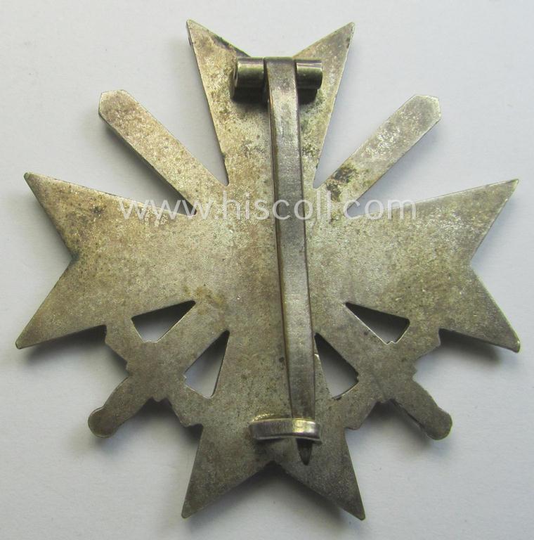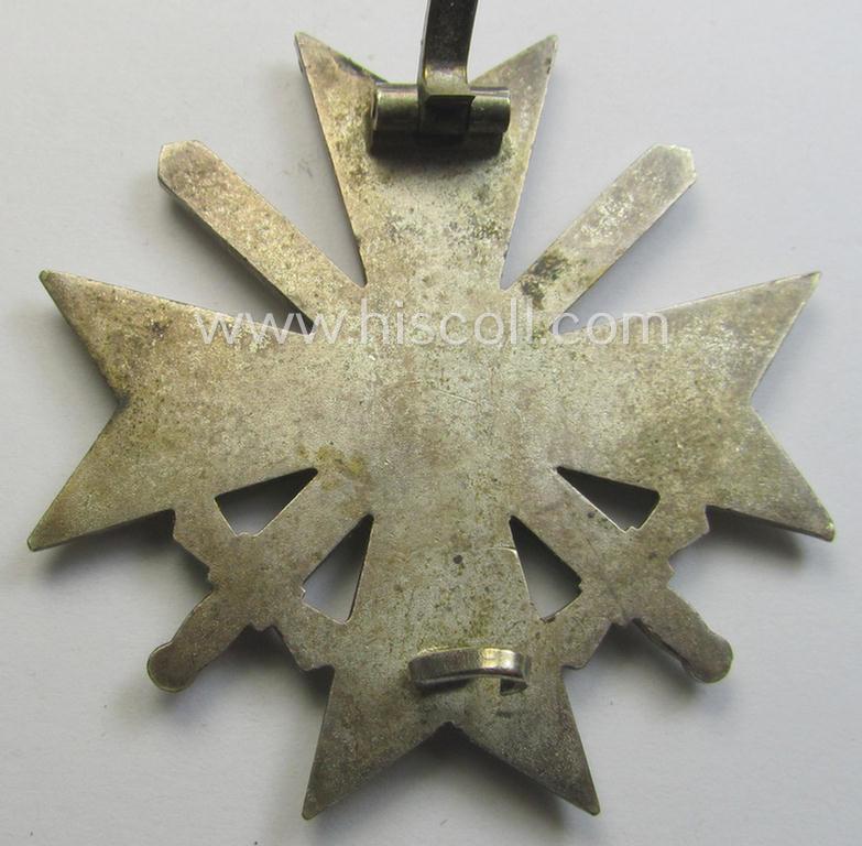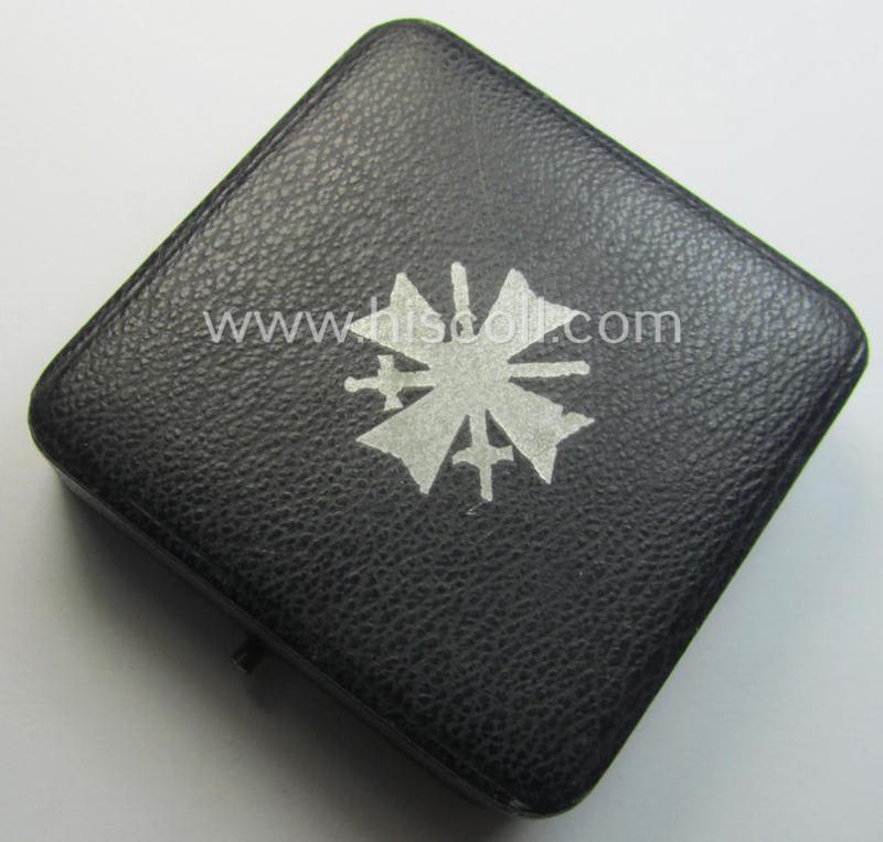 The 'Kriegsverdienstkreuz 1. Klasse mit Schwertern' on offer here is a truly attractive (albeit as more often) non-maker-marked, so-called: 'Buntmetall'- ie. 'Tombak-'based specimen that was just moderately used and/or worn: it came still stored in its original (and truly fairly luxuriously-styled!) black-coloured etui as produced, issued and/or stored for decades. The attractive - and I deem typical early-war-period - specimen is executed in bright-silver-coloured- and/or: 'Buntmetall'-based metal and comes in an overall nice- (albeit moderately worn- and used-), condition. The naturally non-magnetic- and/or non-vaulted cross shows a somewhat tarnished age-patina but has not recently been cleaned or polished: it still retains most of its 'frosted' silverish-coloured finish and retains a fair bit of its high-polished sides (ie. 'hochpolierte Kanten') as can be seen on the pictures. The cross comes naturally mounted onto its functional (straight-shaped- ie. flattened) pin- and/or: period catch (ie. catch-set-up) which are both present and unaltered (as can be seen on the pictures). The piece - which is void of a makers'-designation (as more often encountered by pieces produced by this maker) - comes as found and/or stored for decades. The etui comes in an equally nicely preserved condition: it is fully functional (and shows the printed and/or silverish-grey-coloured 'KvK'-symbol on its top). The etui has a fully preserved, black-coloured- (ie. velvet-based-) interior-section that also shows the printed makers-designation: 'Kerbach & Oesterhelt - Dresden A1' printed into its lid (as can be seen on the pictures). Simply a nice occasion to acquire an attractive and fully complete: 'Kriegsverdienstkreuz 1. Klasse mit Schwerter'-set for a justified price!