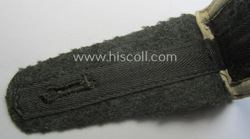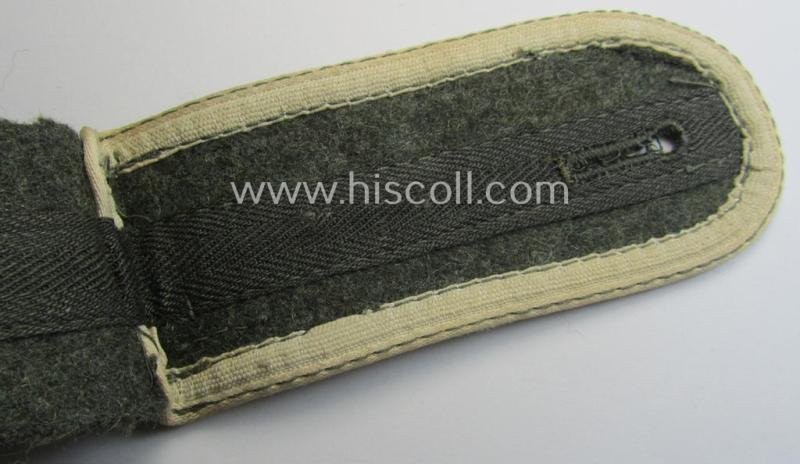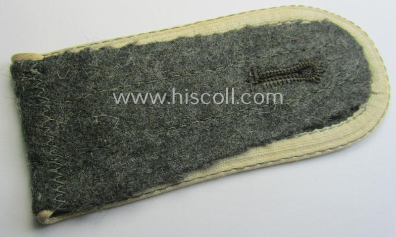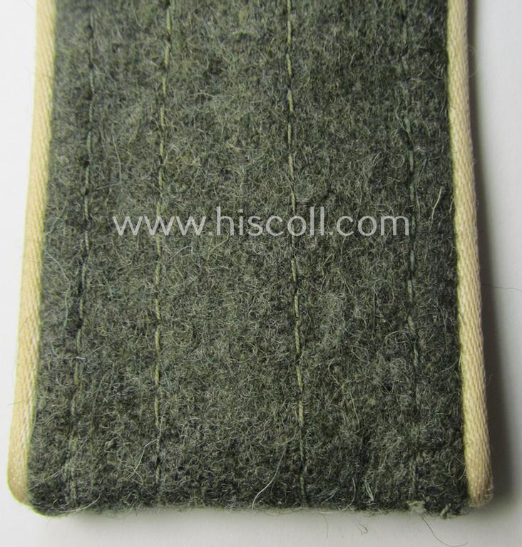 The attractive - and with certainty not that easily found! - WH (Heeres) enlisted-mens'-type shoulderstrap shows the desirable white- (ie. 'weisser'-) coloured and/or: typical 'silk-like'-type piping attached and measures approximately 10,5 cms. in length and is clearly of the simplified. so-called: 'last-ditch'- (ie. 'M44'-) pattern. The shoulderstrap is constructed from the (typical) field-grey-toned, later-war-type wool and comes naturally mounted onto its functional tongue (as can be noticed on the pictures). The strap just shows some minimal age ie. wear and was clearly used and/or worn as such. It should be noted that these white-piped- (thus 'Infanterie'-related) and/or later-war period- (ie. 'simplified'- ie. 'M44'-pattern-) enlisted-mens'-type shoulderstraps are quite desirable and can easily be graded 'scarce' even more so when they come in such a nicely preserved condition as the strap on offer here!
