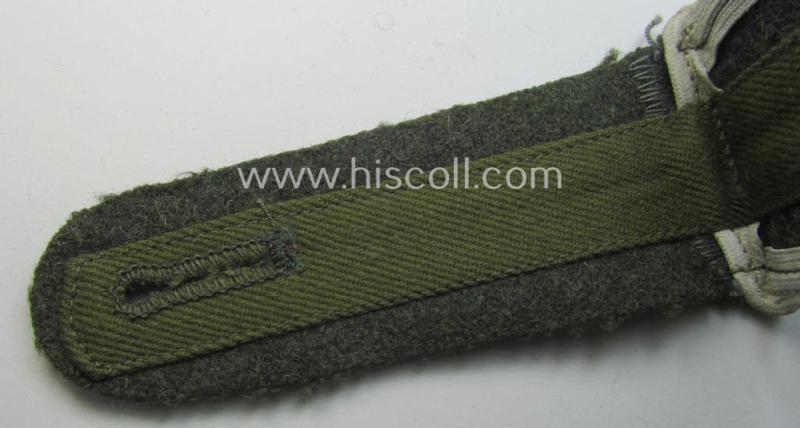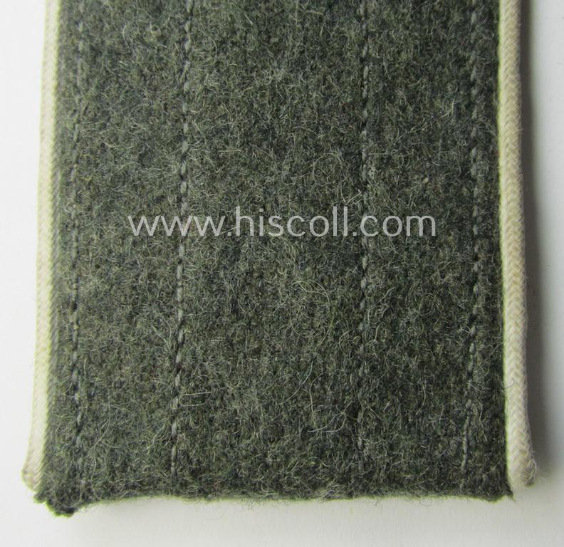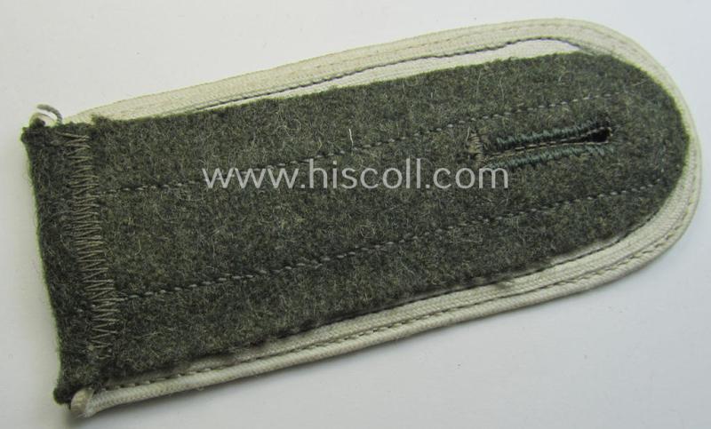 The attractive - and with certainty not that easily found! - WH (Heeres) enlisted-mens'-type shoulderstrap shows the desirable white- (ie. 'weisser'-) coloured and/or: typical 'silk-like'-type piping attached and measures approximately 10,5 cms. in length and is clearly of the simplified. so-called: 'last-ditch'- (ie. 'M44'-) pattern. The shoulderstrap is constructed from the (typical) field-grey-toned, later-war-type wool and comes naturally mounted onto its functional tongue (as can be noticed on the pictures). The strap just shows some minimal age ie. wear and was clearly used and/or worn as such. It should be noted that these white-piped- (thus 'Infanterie'-related) and/or later-war period- (ie. 'simplified'- ie. 'M44'-pattern-) enlisted-mens'-type shoulderstraps are quite desirable and can easily be graded 'scarce' even more so when they come in such a nicely preserved condition as the strap on offer here!