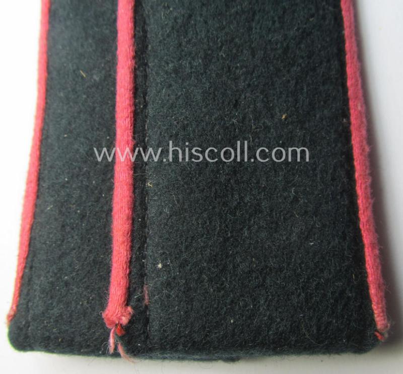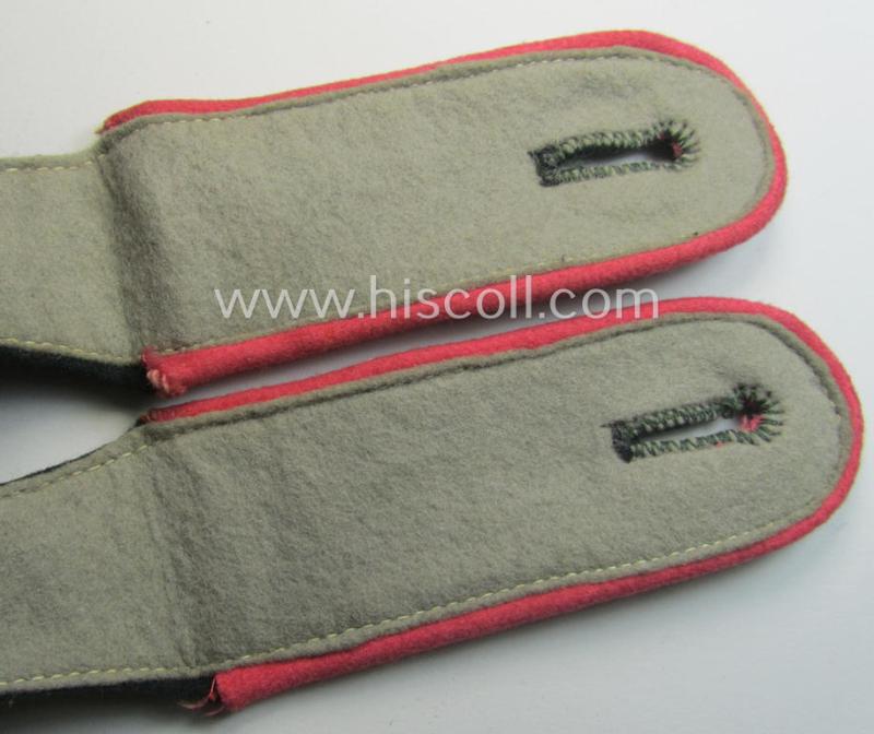 This is a an attractive - and/or fully matching and with certainty scarcely encountered! - pair of typical privately-purchased- (and entirely boiled-woolen-based!) WH (Heeres) early-war period- (ie. 'M36'- ie. 'M40'-pattern and/or: rounded-style) enlisted-mens'-type shoulderstraps as was piped in the desirable bright-pink- (ie. 'rosaroter'-) coloured branchcolour as was intended for usage by a: 'Soldat eines Panzer- o. Panzerjäger-Regiments o. Abteilungs' and that comes in an overall nice- (ie. I deem clearly used- and/or worn-), condition. The neat straps - which have the 'standard'-pattern, darker-green coloured and/or 'smooth'- ie. 'boiled', woolen-based 'upperdecks' - show the neat bright-pink- (ie. 'rosaroter'-) coloured (and/or also 'felt-like'-type-) piping attached (as can be seen on the pictures). They each measure approximately 11 cms. in length and come mounted onto their functional tongues and come in a very nice- ie. fully 'text-book' condition, overall. The pair shows - as stated above - just moderate usage (just some minimal age, dust and/or staining is visible and/or present). The pair is a typical 'privately-produced' pair. It should be noted that ALL enlisted-mens'-pattern 'Panzer- o. Panzerjäger'-type shoulderstraps can easily be regarded 'fairly scarce'. In any case is this an attractive and/or: early-war-period, 'Heeres'-Panzer-related EM-type shoulderstrap-pair that was intended for usage by a: 'Soldat eines Panzer- o. Panzerjäger-Regiments o. Abteilungs': it will be very hard to upgrade this attractive and untouched pair!