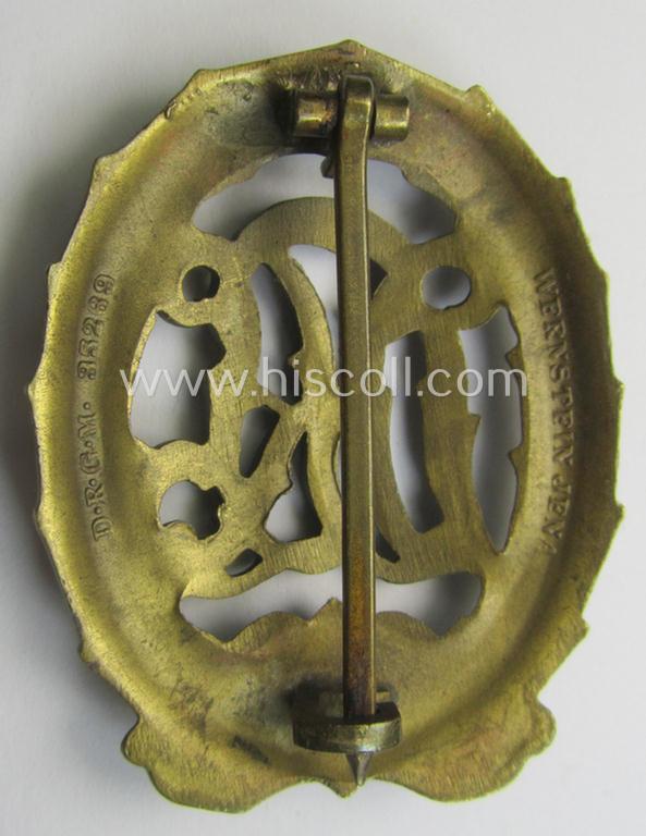 The attractive DRL-sports'-badge is of the version with swastika and truly retains all of its (somewhat darkened- and/or typical bronze-coloured-) finish. As stated above, is the badge nicely maker-marked: 'Wernstein - Jena' on its back (as can be seen on the pictures). Next to this, it also bears the 'D.R.G.M.'-marking and number as to be expected for a DRL-sports-badge. The sports-badge - which comes naturally mounted onto its fully functional and unaltered pin- and/or pin-catch set-up in place - was I deem never cleaned nor polished and retains a minimally tarnished age-patina (as can be seen on the pictures). Simply an attractive example that will be very hard to be upgraded and that is with certainty accordingly priced!