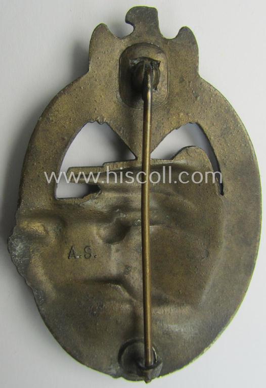 'Panzerkampfabzeichen in Bronze' (or: bronze-class panzer-assault badge or PAB) being a clearly maker- (ie. 'AS'-) marked- and/or zinc- (ie. 'Feinzink'-) based specimen, as was procuced by the: 'Adolf Scholze'- (ie. 'A.S.'-) company