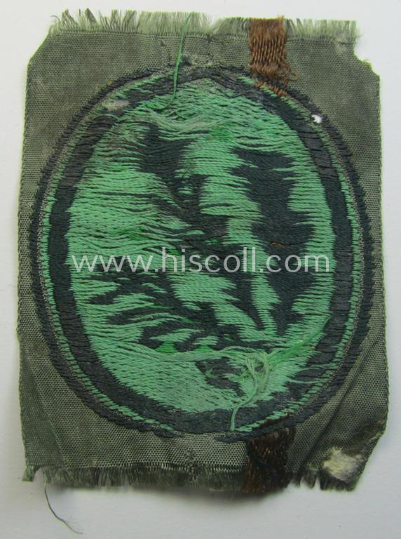 This is a neat - and I deem never simply used nor tunic-attached - example of a WH (Heeres) so-called: 'Jäger'-armpatch being a (typical) 'BeVo'-woven example as was executed on field-grey-coloured linnen as was intended for usage by the: 'Jäger-Truppen' and that comes in an overall nice- (ie. I deem never worn-), condition. These attractive 'Jäger'-armpatches (as was intended for usage by the: 'Jäger-Truppen'- or: rifle-troops throughout the war) are showing three oakleaves on a darker-green-coloured background and were worn on the right upper-sleeve by the troops that were attached to the various 'Jäger'- (ie. rifle-) regiments (being some sort of mid-war-period, mountain-troop-related, infantry-units). The piece is executed in the so-called: 'BeVo'-weave-pattern and was never confectioned nor pre-folded and comes as recently found. The piece - that originated from a small cloth insignia-lot that was originated from the USA where it was brought as a so-called: 'veteran bring-back'-item - does show some minimal age and/or staining ie. storage-age: it is still a bit wrinkled as found (as can be seen on the pictures). Simply a neat occasion to aquire an attractive, 'BeVo'-woven a neat (and of course genuine!) Heeres-'Jäger'-armpatch for an interesting price!
