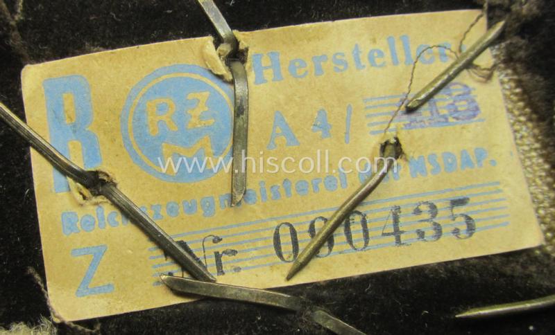 This is an attractive - albeit regrettably single but nevertheless fairly unsually found! - N.S.D.A.P.-type collar-patch (ie. 'Kragenspiegel für politischen Leiter') being of the third- and/or final pattern as was used from 1939 upto 1945 being a piece as was specifically intended for usage by an: 'N.S.D.A.P.-Obereinsatzsleiter' at 'Kreis'-level and that comes in an overall nice- (and I deem just minimally used- ie. worn-), condition. The attractive piece - which is constructed from the darker-brown-coloured- and/or 'smooth-type'- (ie. typical 'velvet-type'-) wool - comes in moderately used- ie. worn condition overall: it shows a greyish-silver-toned (ie. once golden-coloured) eagle-device and three pips period-attached (as can be noticed on the pictures). The tab is piped with typical white- (ie. 'weisser'-) coloured- and/or rayon-based piping (as always) signifying that it was intended for a party-official serving at: 'Kreis'-level. The tab is neatly backed with a piece of 'buckram'-based material and still retains its period-attached, 'RzM'-etiket (as can be seen on the pictures) and does just show minimal wear, age and/or staining. Simply an attractive - and in this particular rank actually usually encountered! - 'Politischen Leiter der N.S.D.A.P.'-collar-tab that is not that often offered for sale and that is I deem accordingly priced!