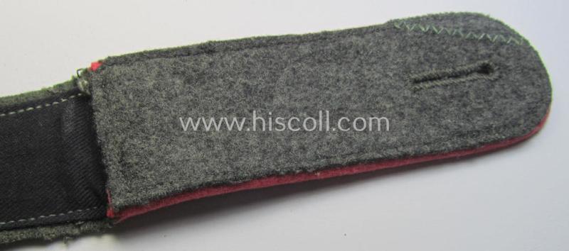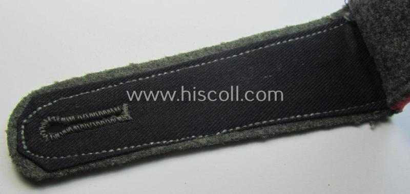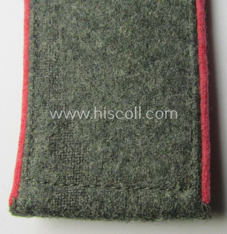 This is an attractive - albeit regrettably single but nevertheless scarcely seen! - (I deem) early- (ie. mid-war-) period, so-called: 'M40 o. M43'-pattern, WH (Heeres) enlisted-mens'-type shoulderstrap as was piped in the bright-pink- (ie. 'rosaroter'-) coloured branchcolour as was intended for a: 'Soldat u. Mitglied eines Panzer- o. Panzerjäger-Abteilungs o. Regiments' (or simple soldier who served witin a tank-destroyer- ie anti-tank unit ie. regiment) and that comes in an overall nice- (I deem clearly issued- and/or: just moderately used- ie. worn-), condition. The shoulderstrap - which measures approximately 12,6 cms. in length as more often seen - has the woolen-type piping attached (as is more encountered with these early- (ie. mid-war-) period shoulderstraps). The shoulderstrap - which originates from a larger cloth- and insignia-collection I recently acquired for the web-site - comes mounted onto its functional tongue (as can be noticed on the pictures). Simply an attractive - and/or fully 'text-book'! - 'M40- o. M43'-pattern, EM-type 'Panzer o. Panzerjäger'-related shoulderstrap that was intended for usage by a: 'Soldat u. Mitglied eines Panzer- o. Panzerjäger-Abteilungs o. Regiments'!