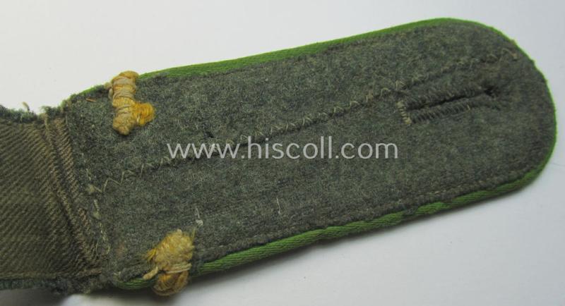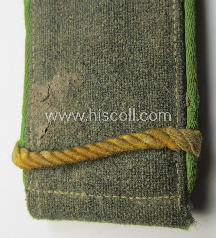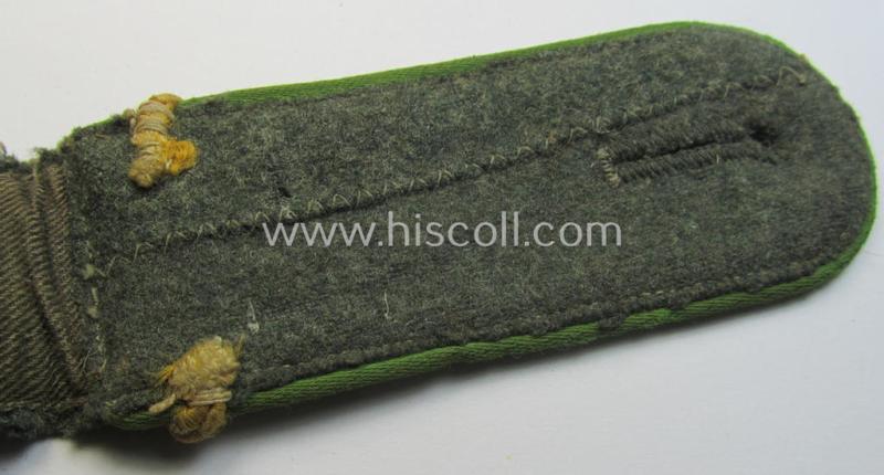 This is a truly attractive - albeit single but nevertheless fairly scarcely encountered! - WH (Heeres) (I deem) early- (ie. mid-)war period- (ie. 'M40- o. M43'-pattern) enlisted-mens'-type shoulderstrap as was piped in the desirable bright-green- (ie. 'wiesengrüner'-) coloured branchcolour, as was specifically intended for usage by a: 'Soldat der Panzer-Grenadier-Truppen' (ie. simple soldier who served within an infantry-related, so-called: rifle-regiment ie. unit) that comes with a golden-yellow-toned regimental-indicator 'Lasche' period-attached and that comes in an overall very nice- (albeit just moderately used- ie. worn-), condition. The neat shoulderstrap - which measures approximately 11,5 cms. in length - has the typical field-grey-coloured- and/or woolen-based 'upperdeck' (that shows some staining) and has the neat (and desirable!) bright-green- (ie. 'wiesengrüner'-) coloured- and/or desirable 'silk-like'-type, piping, attached. The strap comes mounted onto its period tongue and does show some obvious wear, usage and/or minimal age. Simply an attractive - and actually scarcely found! - EM-type 'Panzergrenadiere'-shoulderstrap that belonged to a: 'Soldat der Panzer-Grenadier-Truppen': too bad that it is only a single specimen!