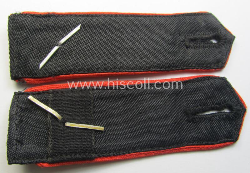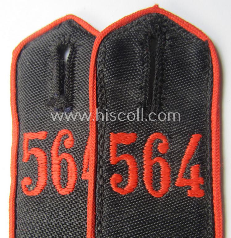 The neat pair - which was just moderately used- ie. worn - comes in an overall very nice- (ie. carefully shirt- or tunic-removed-) condition. The straps - which are executed in typical black-coloured linnen, having the bright-red- (ie. 'hochroter'-) coloured- and/or neatly machine-embroidered '564'-numerals and/or equally coloured (rayon-based) piping attached. The straps - that come without tongues as found - measure 11 cms. in length each as usually encountered and were clearly used as a pair of the 'sew-in-pattern' and can as such easily serve to complete any HJ tunic ie. 'Dienstbluse'. Both straps are void of an 'RzM'-etiket something that is is more often seen (as can be seen on the pictures). The pair shows a (matching, smaller-sized) pair of zinc-based pips attached denoting the rank of a: 'Kameradschaftsführer'. Both straps show just some minimal storage-age only and come (as stated above) in a very nice condition without showing any damage or alike. It should be noted that all matching pairs of 'Allgemeine-HJ' can easily be graded 'scarce' and come not that often for sale even more so when they were intended for the unusual (Austrian-based) 'Bann 564': being the 'Bann Villach' as was situated in the: 'Gebiet Südost-Kärnten'!