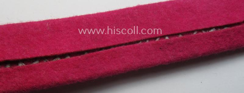 This is an attractive - simply never worn ie. 'still virtually mint'! - WWII- (ie. TR-) period, woolen-based (factory) fire-brigade (ie. 'Feuerwehr'-) related cuff-title (ie. 'Ärmelstreifen') entitled: 'Werkfeuerwehr' that comes in an overall very nicely preserved and/or fully untouched condition. The neat cuff-title is executed in greyish-silver-coloured characters (as executed in Gothic-style!) onto a bright-pink- (or: 'rosaroter'-) coloured- and/or typical woolen-based background. The piece comes in a full-length (and non-confectioned!) condition and measures approximately 44,5 cms. in length: it retains two (unfinished) ends as it left the factory (as can be noticed on the pictures). The cuff-title is totally void of any wear nor age and can easily be graded: 'virtually mint'. It should be noted that these 'Feuerwehr'-related, EM- (ie. NCO-) pattern cuff-titles as used by the various factory fire-brigade staff-members can easily be graded 'fairly scarce'. I deem that I have priced this attractive and fully untouched example, accordingly!