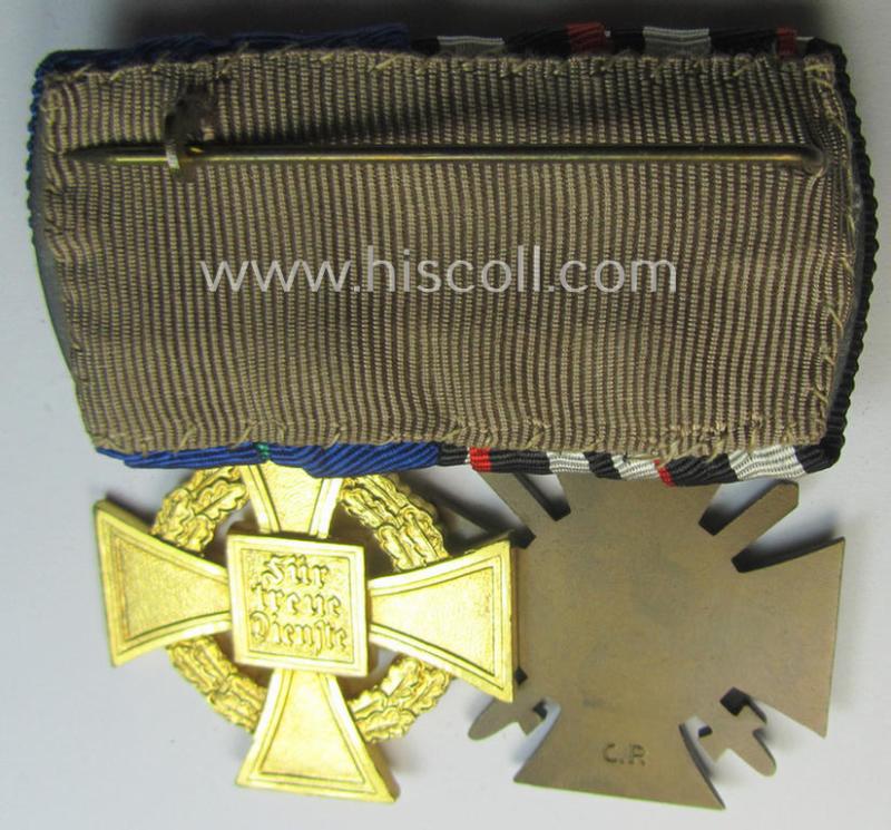 This is an attractive - and in this uncommonly found combination actually not that often seen! - two-pieced medal-bar (ie. 'Doppelspange') respectively depicting a WWI-period: 'Frontkämpferkreuz 1914-18' (ie.: 'Kriegsteilnehmerkreuz mit Schwertern') and a neatly bright golden-toned (ie. 'feuervergoldetes'): 'Treuedienst Ehrenzeichen 1. Klasse' (or: golden-class, loyal-service-medal for 40 yrs. of loyal civil-service) both pieces coming in an overall very nice- (albeit minimally used- ie. worn-), condition. Both awards are truly bronze- (ie. darkened golden) and/or bright-golden-coloured and 'fairly frosted' examples that are just minimally tarnished by age and/or moderate usage and wear (as can be seen on the pictures) but are both void of any damage or alike. Both pieces come naturally mounted on their period ribbons and have a nicely preserved age-patina and are just a tiny bit dirty: they were (I deem) never cleaned nor polished (as can be seen on the pictures). The entire 'Spange' is nicely 'backed' with a piece of beige-coloured (ribbed-style) linnen and shows a (regular-type- and functional) pin- ie. catch-set-up (as can be seen on the pictures). The 'Frontkämpferkreuz 1914-18' is a clearly maker- (ie. 'CPR'-) marked example. The black-enemalled centre of the 'Treuedienst Ehrenzeichen 1. Klasse' is fully present and totally undamaged (as can be noticed on the pictures). Simply an attractive example of a two-pieced WW1- ie. TR-related 'Ordenspange' in an uncommonly found combination that is I deem accordingly priced!