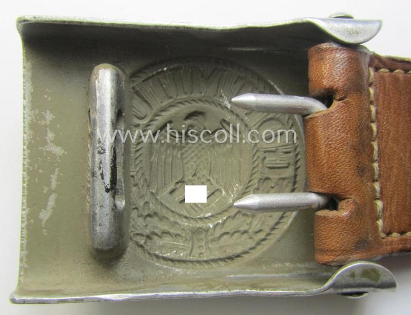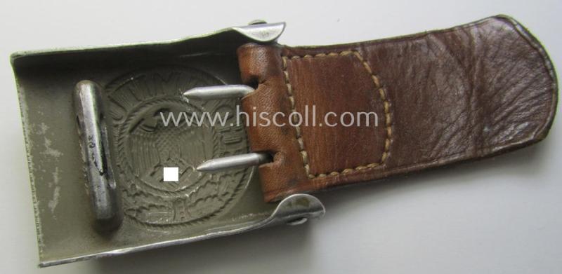 WH (Heeres) 'standard-pattern', field-grey-toned- and aluminium-based belt-buckle being a maker- (ie. 'H. Arld - Nuernberg'-) marked- and/or: '1937'-dated example that comes mounted onto its leather-based tab