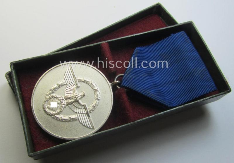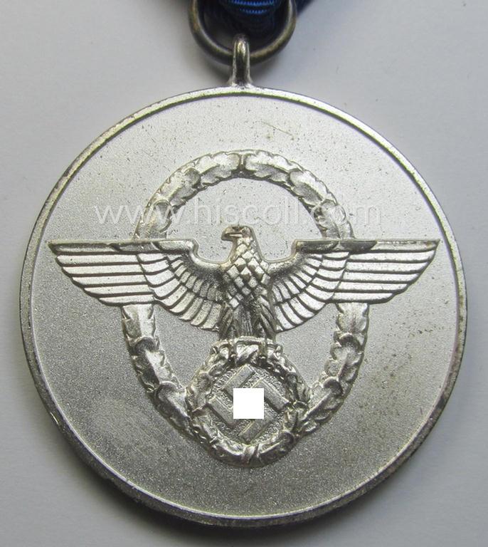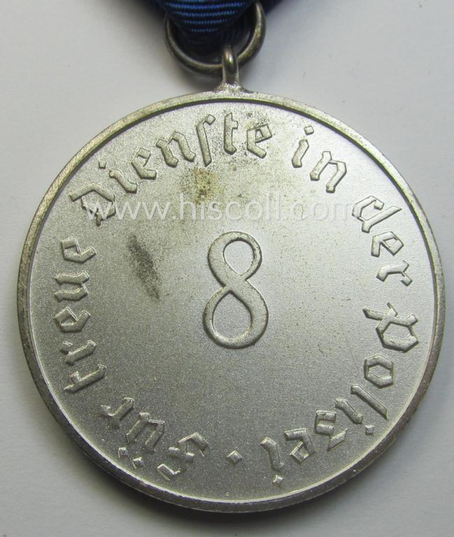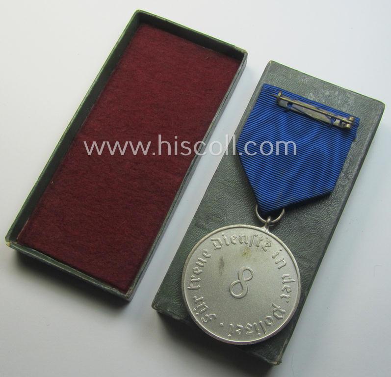This is an attractive example of a silver-class: 'Polizei-Dienstauszeichnung 3. Stufe' (or: police loyal-service medal third class as was awarded for 8 years of loyal service within the various TR-police-services) and that comes mounted onto its (confectioned) period ribbon (ie. 'Bandabschnitt') and that came stored in its original (2-pieced) etui and that comes in an overall very nice- (and I deem only minimally used- ie. worn-), condition. The medal truly retains pronounced details and is just minimally darkened ie. tarnished by age: it retains a fair bit of its 'off-factory' polished-sides (ie. 'hochpolierte Kanten'). The medal retains a great age patina overall (it has possible once been cleaned ie. polished). The award came naturally mounted onto its original, confectioned- (ie. approximately 9 cms. long- and/or: 3,7 cms. wide-sized-) cornflower-blue-coloured ribbon that still retains its copper-toned 'clip' (mounted for easily wearing the piece on a tunic). The scarcely found, typical (darker) greenish-coloured (and carton-based-) 2-pieced etui comes in an overall nicely preserved - albeit clearly issued - condition. It shows a silver-toned (and fully undamaged) 'circle' with the number '8' (as can be seen on the pictures). The etui is totally undamaged but does show some minimal wear, age and/or staining (as can be seen on the pictures). Simply a very nicely preserved - and/or complete! - 8-yrs. police loyal-service-medal-set!