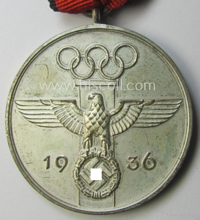 'Deutsche Olympia-Erinnerungsmedaille 1936' being a non-maker-marked example that comes mounted onto its original ribbon (ie. 'Bandabschnitt') and that comes stored in its typical, beige-white-coloured etui