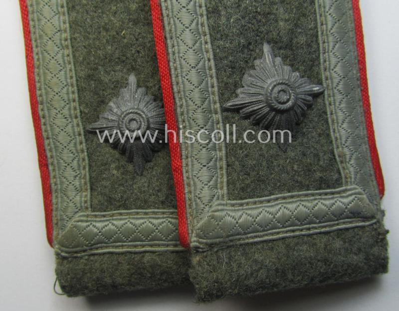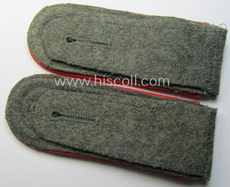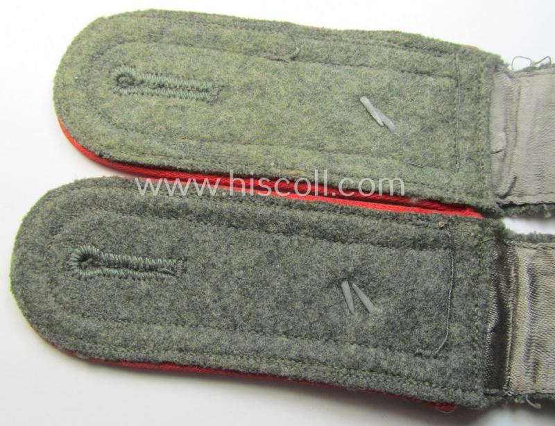 This is an attractive - just minimally used and/or fully matching! - pair of typical 'standard-issued'- (ie. non-'tailor-made'-) pattern, WH (Heeres) early- (ie. mid-) war period- (ie. 'M41'- ie. 'M43'-pattern) NCO-type shoulderstraps (ie. 'Schulterklappen für Unteroffiziere des Heeres') as was piped in the desirable bright-red- (ie. 'hochroter'-) coloured branchcolour as was specifically intended for usage by a: 'Wachtmeister o. Feldwebel eines (Sturm)Artillerie-Abteilungs o. Regiments' (or: sergeant who served within an artillery unit or regiment) and that comes in an overall very nice- (ie. I deem just moderately used- ie. worn-), condition. The neat straps - which have the 'standard'-pattern, field-grey-coloured and/or typical woolen-based 'upperdecks' and that measure approximately 12 cms. in length each - show the neat bright-red- (ie. 'hochroter'-) coloured and/or desirable 'silk-like'-type piping attached (as can be seen on the pictures). The straps - that show the typical bluish-grey-toned (ie. sub-dued) NCO-braid and a pair of (regular-sized, zinc-based) pips period-attached - come naturally mounted onto their period (regular-shaped) tongues attached and come both in a very nice- (ie. fully 'text-book') condition overall (as can be seen on the pictures). The pair only shows minimal wear and/or age and is just very nicely preserved (as can be seen on the pictures). I deem this an excellent occasion to acquire a neat NCO-type, non-privately-purchased '(Sturm)Artillerie'-related shoulderstrap-pair for a justified price!