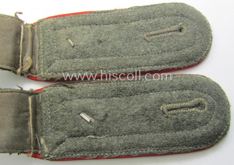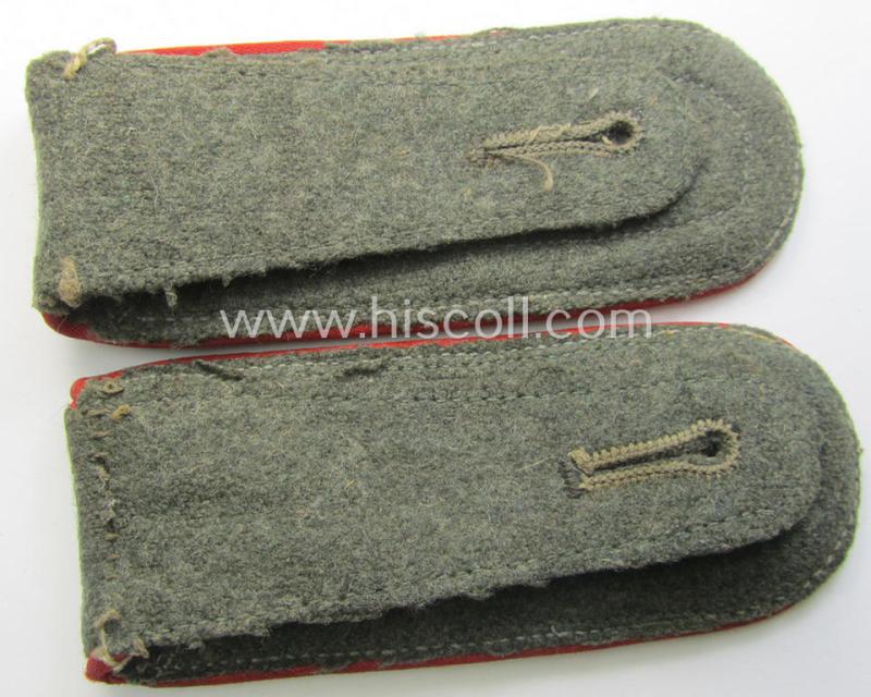 This is an attractive - moderately used and/or fully matching! - pair of typical 'standard-issued'- (ie. non-'tailor-made'-) pattern, WH (Heeres) early- (ie. mid-) war period- (ie. 'M41'- ie. 'M43'-pattern) NCO-type shoulderstraps (ie. 'Schulterklappen für Unteroffiziere des Heeres') as was piped in the desirable bright-red- (ie. 'hochroter'-) coloured branchcolour as was specifically intended for usage by a: 'Wachtmeister o. Feldwebel eines (Sturm)Artillerie-Abteilungs o. Regiments' (or: sergeant who served within an artillery-unit or regiment) and that comes in an overall nice- (ie. I deem just moderately used- ie. worn-), condition. The neat straps - which have the 'standard'-pattern, field-grey-coloured and/or typical woolen-based 'upperdecks' and that measure approximately 12 cms. in length each - show the neat bright-red- (ie. 'hochroter'-) coloured and/or desirable 'silk-like'-type piping attached (as can be seen on the pictures). The straps - that show the silverish-grey-toned (ie. 'dotted'-pattern) NCO-braid and a pair of (regular-sized, zinc-based and somewhat stained) pips period-attached - come naturally mounted onto their period (regular-shaped) tongues attached and come both in an overall nice- (ie. fully 'text-book') condition overall (as can be seen on the pictures). The pair only shows moderate wear and/or age and is just nicely preserved over the years (as can be seen on the pictures). I deem this an excellent occasion to acquire a neat NCO-type, non-privately-purchased '(Sturm)Artillerie'-related shoulderstrap-pair for a justified price!