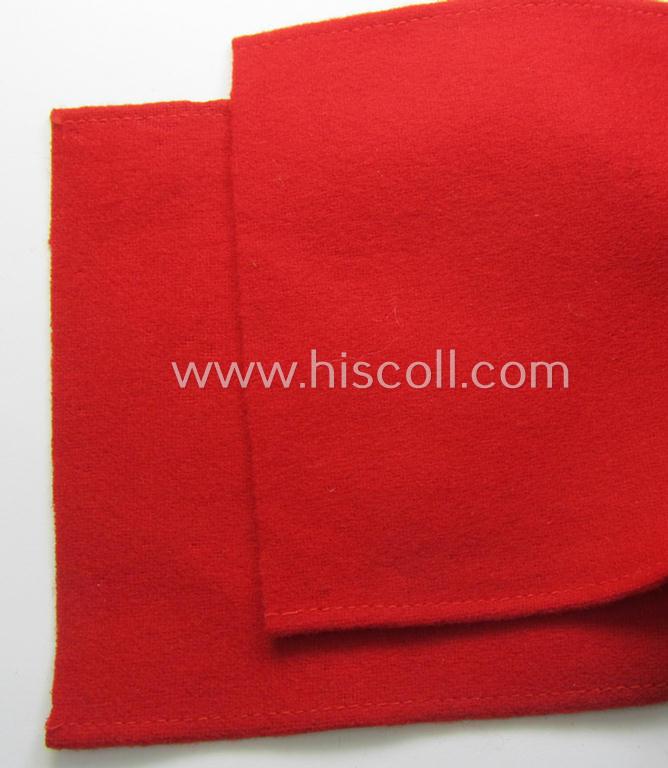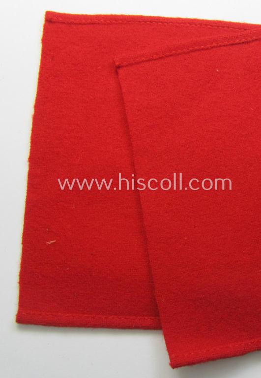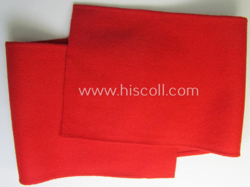 This is a truly very attractive - simply never used and with certainty scarcely encountered! - N.S.D.A.P.-pattern, smooth-woolen-based swastika-armband (ie. 'Armbinde') being an example of the so-called: 'Extra Qualität'-type and that comes in an overall very nice- (simply never used- ie. still 'virtually mint'-), condition. The neat piece - which is constructed from the somewhat darker-red-coloured- and/or typical 'smooth-type'- (ie. moleskin-type) wool showing a seperately attached (linnen-based) roundel and (braid-based) swastika as to be expected - comes in a very nice condition overall: it was simply never used nor even stitched-together and measures approximately 49 x 11 cms. The armband is not piped as to be expected and still shows its period-attached, paper-based: 'RzM'-etiket (something that is most certainly not always the case). The armband shows some minimal storage-age only, simply caused by having been stored as such for decades. These generic swastika-armbands were worn on the left upper-arm and were intended for usage by the various N.S.D.A.P.-party-members and/or officials (but were also worn by members of various other Third Reich organisations such as for example the members of the N.S.K.K., RAD, SS and/or SA to mention a few). In any case is this an attractive - and with certainty not that easily encountered! - swastika 'Armbinde' of the 'Extra Qualität' that comes not that often offered for sale. I deem that this acttractive example is accordingly priced!