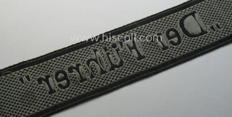 Waffen-SS, 1943-pattern cuff-title (ie. 'Ärmelstreifen') depicting the machine-woven Latin script text in silver-grey linnen as was specifically intended for usage by a member of the: 'SS-Regiment “Der Führer”