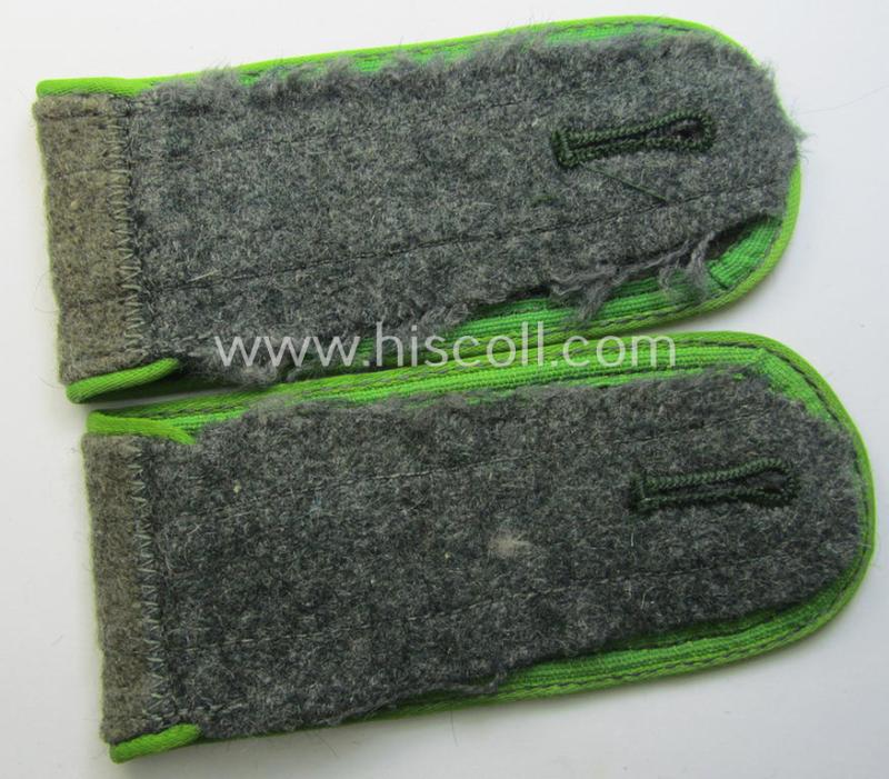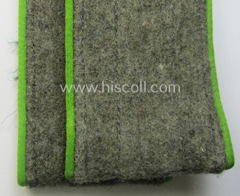 This is an attractive - fully matching and (I deem) just minimally or even never used - pair of typical, later-war-period, WH (Heeres) so-called: 'M44'-styled (ie. 'simplified') enlisted-mens'-type shoulderstraps as was piped in the neat bright-green- (ie. 'wiesen- o. hellgrüner'-) coloured branchcolour as was intended for a: 'Soldat eines Panzergrenadiere-Regiments' (or: simple soldier who served within a later-war-period, infantry-related so-called: rifle-regiment) and that comes in an overall very nice- (ie. I deem just minimally used- ie. worn-), condition. The straps - which are approximately 11 cms. sized in length each - have the 'standard-pattern'- and/or typical, field-grey- (ie. somewhat earthen-brown-) coloured and/or woolen-based 'upperdecks' and show the neat bright-green- (ie. 'wiesengrüner'-) coloured and/or: 'silk-like'-type branchcolour (ie. piping) attached. The straps are constructed following the typical '1944 cloth-minimising production-manner' using different shades of wool and/or material (as can be seen on the pictures). The straps show some minimal staining simply caused by minimal wear and/or decades of storage only. It should be noted that all 'M44'-style, EM-pattern shoulderstraps are actually quite hard to encounter and can easily be graded 'scarce': the ones as intended for the 'Panzergrenadier-Truppen' even more so! Simply a nice occasion to acquire an attractive - and fully 'text-book'! - M44-styled, enlisted-mens'-type shoulderstrap-pair as was intended for usage by a: 'Soldat eines Panzergrenadiere-Regiments': great to complete any later-war M44- (ie.even M43-) model 'Heeres'-tunic!