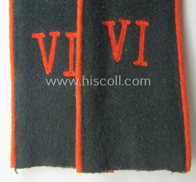 This is an attractive - and/or fully matching! - pair of early- (ie. pre-war) period- (ie. 'M36- o. M40'-type'- and/or rounded styled) neatly 'cyphered', WH (Heeres) enlisted-mens'-type shoulderstraps as piped in the bright-orange- (ie. 'orangeroter'-) coloured branchcolour as was specifically intended for usage by a: 'Soldat des des Wehr-Ersatzdienstelle im Wehrkreises VI' (or simple soldier who was part of the recruitment-troops within the area of: 'Wehrkreis VI' being a larger area situated around the city of Hannover and of which its staff was residing in the town of Münster) and that comes in an overall very nice- (ie. I deem just moderately used- ie. worn-), condition. The neat straps show some moderate age and/or wear and have the darker-green-coloured- and/or woolen-based 'upperdecks': they do show as stated above the bright-orange- (ie. 'orangeroter'-) coloured branchcolour and/or woolen-type piping. The shoulderstraps never had any tongues attached and were clearly used as a pair of the so-called: 'sew-in'-pattern. The straps - which measure both approximately 13 cms. in length each - show the neatly embroidered (by means of so-called: 'Kurbelstickerei') and Roman-styled 'VI'-numerals ie. 'Ziffern' (which are executed in orange-coloured stitching) denoting that it was a pair that was intended for a soldier who was attached to the: 'Wehr-Ersatzdienstelle im Wehrkreises VI'. The straps - that originate from my private shoulderstrap-collection - show some obvious age and/or wear (as can be seen on the pictures). Simply a very decorative and/or fully 'text-book' and actually not that often encountered! - 'Heeres'-type, 'cyphered' shoulderstrap-pair that belonged to a: 'Soldat des des Wehrersatzdienstelle im Wehrkreises VI'!