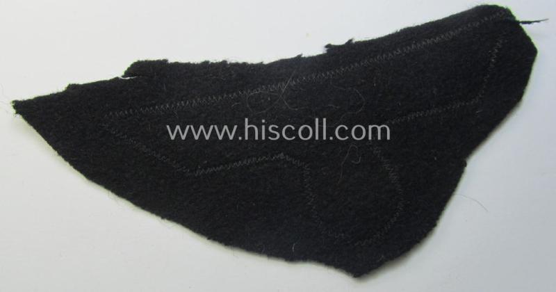 This is an attractive - and actually truly unusually seen! - just moderately worn example of a WH (Heeres) 'Panzer' enlisted-mens'- (ie. NCO-) type breasteagle (ie. 'Brustadler für Mannschaften und Unteroffiziere des Heeres') that comes still (period-machine-sewn!) onto a piece of a black-coloured, Heeres, 'Panzer'-'wrap-around-tunic' and that comes in a moderately used- and/or carefully 'clearly cut-out of a tunic', condition. The breast-eagle - that is of the neatly machine-embroidered- (ie. 'BeVo'- ie. 'M39/M40'-) pattern - is of the white-toned type as woven onto a black-coloured background and comes still mounted onto a piece of typical black-coloured tunic-cloth ie. wool: moreover, is the piece neatly sewn-on by means of machine-stitching (as can be noticed on the pictures). The (unique) piece originated from the USA where it was stored for decades a so-called: 'veteran bring-back'. Simply an attractive - and truly unusually found! - WH (Heeres) 'Panzer'-breast-eagle ie. 'cut-out-piece' that is I deem accordingly priced!
