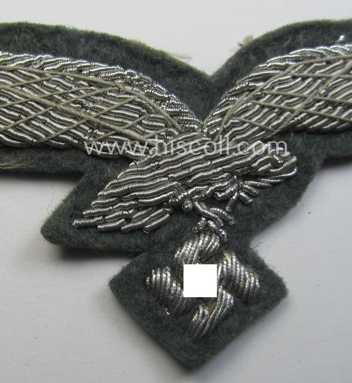 This is a very attractive - and actually not that easily found! - WH (Luftwaffe) officers'-pattern visor-cap-eagle (ie. 'Adler für Luftwaffen Offiziers-Schirmmütze') being a neatly hand-embroidered example of the: 'Extra Qualität' that comes mounted onto a typical bluish-grey-coloured- and/or (smooth) woolen-based background and that comes in an overall very nice- (ie. simply never used- ie. 'virtually mint ie. unissued'-), condition. This - with certainty 'high-quality'-produced example - is executed in multi-toned, silverish 'braid' on a 'smooth'-type, woolen- and/or bluish-grey-coloured background and has an approximate 'wingspan' of 6,8 cms.: it show a greyish-black-toned (and linnen-based) 'backing' in place (as can be seen on the pictures). Simply an attractive - and most certainly not that easily found! - piece of Luftwaffe-related officers'-visor-cap-insignia that would nicely fit to restore any Luftwaffe officers'-type visor-cap!
