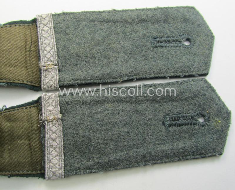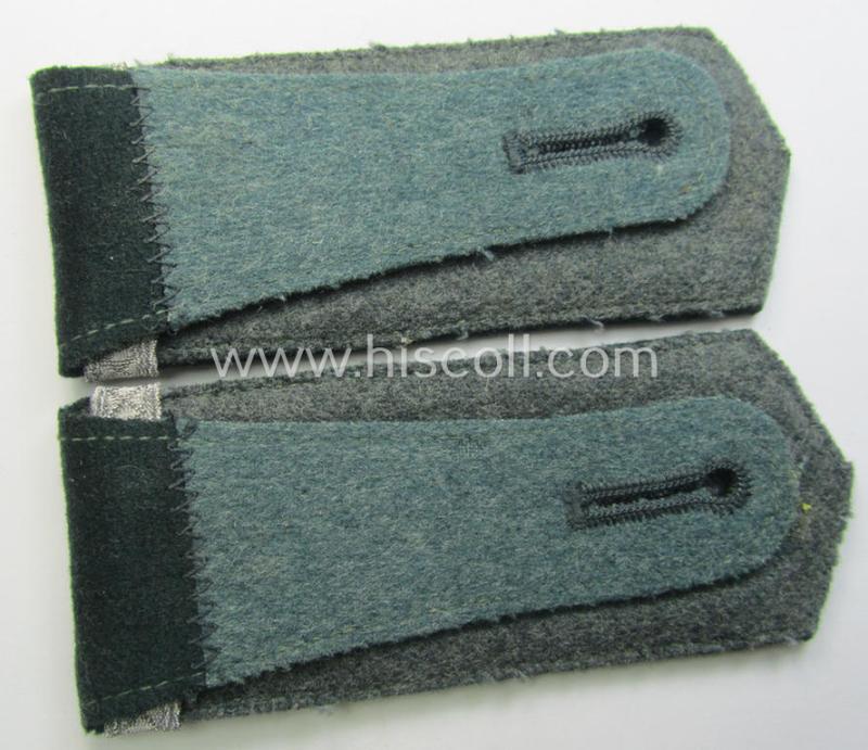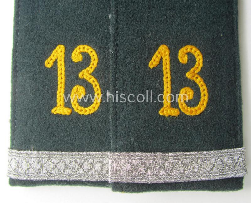 This is a truly attractive - fully matching and actually scarcely found! - pair of WH (Heeres), early- (ie. pre-) war-period, 'M36'-pattern (pointed-styled), 'cyphered' enlisted-mens'-type shoulderstraps (being a pair having no branchcolour ie. piping as per regulation) as was intended for usage by a: 'Soldat u. Unteroffiziers-Anwärter des Kavallerie- o. Reiter-Regiments 13' (or: simple soldier and NCO-candidate who served within the cavalry regiment, numbered: '13') and that comes in overall very nice- (albeit minimally used- and/or worn-), condition. The neat straps - which are both approximately 11 cms. sized in length - have the 'standard-pattern' and/or: darker-green-coloured- (and smooth woolen-based) 'upperdecks' and have as stated above no piping nor branchcolour attached: they are of the 'generic pattern' (as can be seen on the pictures). The shoulderstraps show the neat, golden-yellow- (ie. 'goldgelbener'-) coloured and/or machine-embroidered: '1'- and '3'-numerals ie. 'Ziffern' (which are executed in so-called: 'Kurbelstickerei' as to be expected). The pair comes naturally mounted onto its original tongues and does just show some minimal age-, wear and/or staining. Moreover, do both straps shows a (single-pieced, silver-toned) 'Lasche' period-attached, denoting that the soldier who wore this pair was an: 'Unteroffiziers-Anwärter' (or: NCO-candidate) as can be seen on the pictures. Simply a neat - and I deem quite early- (ie. pre- or early-war-) period - 'Heeres' EM-type, shoulderstrap-pair that belonged to a: 'Soldat u. Unteroffiziers-Anwärter des Kavallerie- o. Reiter-Regiments 13': I deem that I have priced this very attractive - and surely desirable! - Heeres-pair, accordingly!