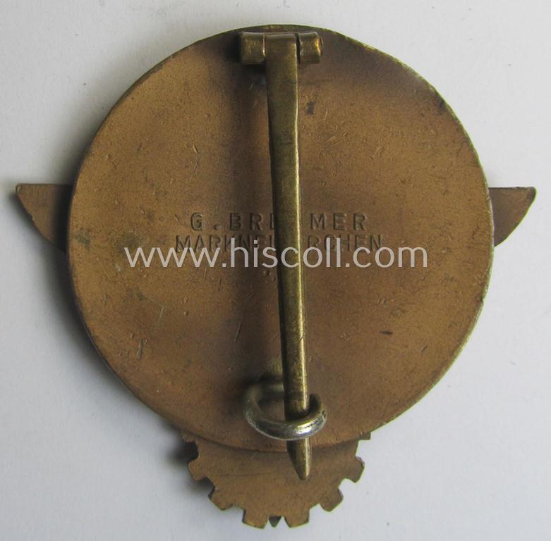 This is an attractive - nicely preserved and actually not that easily encountered! - 'HJ'- ('Hitlerjugend') ie. 'BDM'- ('Bund Deutscher Mädel') related, so-called: 'Reichsberufswettkampf-Siegerabzeichen' being a high-quality (ie. typical 'Buntmetall'-based!) and neatly maker-marked award (of the 2nd model) bearing the text: 'Kreissieger 1938' and that comes in an overall very nice- (albeit minimally worn- and/or used-), condition. The attractive badge is (as stated above) executed in high-quality, golden-bronze- ie. copper-toned metal (ie. 'Buntmetall') and is nicely maker-marked on its back with the makers'-designation of the maker: 'G.Brehmer - Markneukirchen' (as can be seen on the pictures). The badge comes in a just moderately used- ie. worn condition but is totally void of enamel-damage as can be seen on the pictures). It is furthermore just a tiny bit tarnished ie. dusty caused by normal age (as can be seen on the pictures). The badge comes naturally mounted onto its (fully functional- and totally unaltered!) catch and/or functional pin- (ie. catch) attachment. The badge has a wonderful appearance and has never been cleaned nor polished. Simply an attractive 'youth-related'-award that is - I deem - priced according to its very nice and totally untouched, condition!