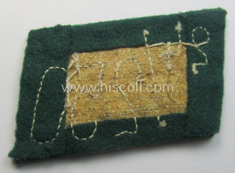 This is a neat - albeit regrettably single! - specific SA (ie. 'Sturmabteilungen') collar-patch (ie. 'Kragenspiegel') as executed in darker-green-coloured wool as was (I deem) intended for usage by an: 'SA-Mitglied' serving within the: 'SA-Standarte 24' ('SA-Gruppe Kurpfalz o. Nordsee') being a just moderately used- (and/or carefully tunic-removed) example. The piece - that shows a typical 'buckram'-based 'backing' - comes in an overall very nicely preserved condition and shows the (white-toned) '24/250'-numerals (ie. cyphers or 'Ziffern') as executed in white-coloured linnen- or wool which are executed by means of so-called: 'Kurbelstickerei' (as can be seen on the pictures). Simply a nicely preserved - and most certainly not that easily encountered! - SA-Kragenspiegel that belonged to an: 'SA-Mitglied' serving within the 'SA-Standarte 24' (belonging to the: 'SA-Gruppe Kurpfalz o. Nordsee') and that is I deem accordingly priced!