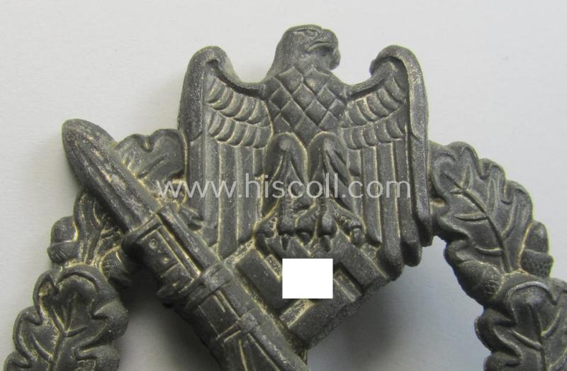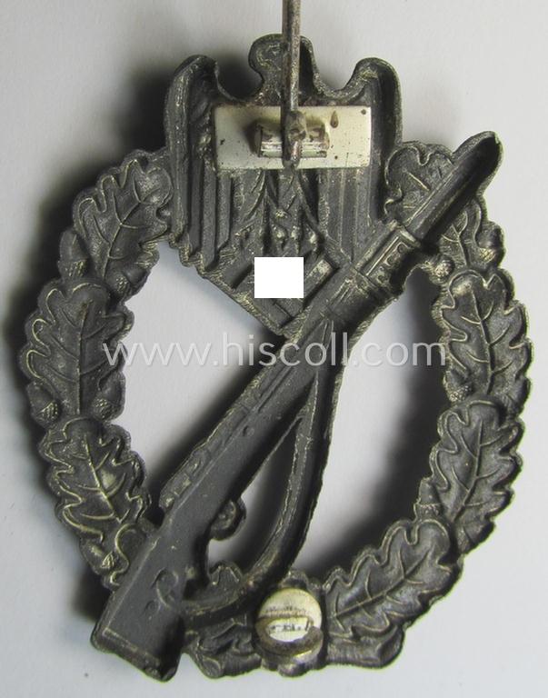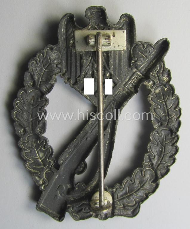 'Infanterie Sturmabzeichen in Silber' (or: silver infantry-assault badge ie. IAB) being a non-maker-marked (and 'hollow-back'-pattern) example as executed in zinc-based metal (ie. 'Feinzink') as was produced by the: 'Wilh. Deumer'-company