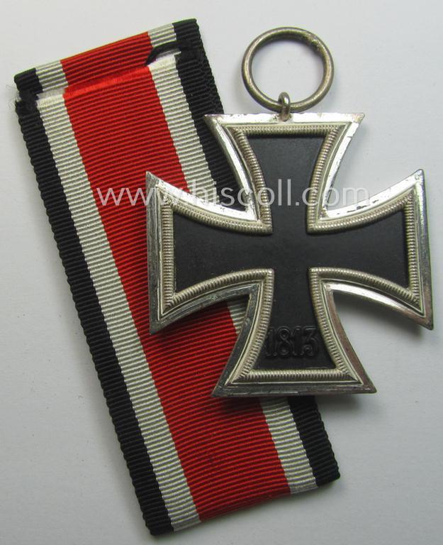 The attractive piece - which was surely issued but that was (I deem) simply never worn nor used - came together with its pre-folded and/or non-confectioned (and approx. 29 cms. long-sized) ribbon (ie. 'Bandabschnitt'). The cross - which is totally void of a stamped makers'-designation into its ring (as can be noticed on the pictures) - was with certainty never cleaned and has a superb and/or attractive age-patina: it truly retains almost all of its so-called: 'hochpolierte Kanten' (or: polished sides) and has a minimally darkened- (ie. hardly 'blackened'- ie. stained) finish (as can be seen on the pictures). The cross has a very nicely preserved, black-finished (ie. somewhat 'satin-like'- ie. somewhat matted-) core: it is totally void of any damage nor paint-loss (as can be seen on the pictures). The piece is just a tiny bit dusty and/or stained but was never cleaned nor polished. The cross is (I deem) an evident specimen that was produced by the desirable maker: 'Rudolf Wächtler & Lange' as was based in the town of Mittwaida in Sachsen (ie. 'Hersteller 100'): it has very nice and/or pronounced detail as to be expected for a cross by this desirable maker. The IC was recently found at a German private-household and was never before in collectors'-hands. Simply a superb, non-maker-marked 'EK II. Klasse' that is with certainty accordingly priced: most certainly one of the best such examples I had on offer for quite some time!