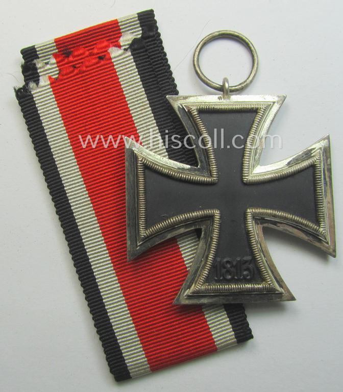 The truly attractive piece - which was surely issued but that was simply never mounted - came together with its folded and/or non-confectioned (and approx. 29 cms. long-sized-) ribbon (ie. 'Bandabschnitt'). The cross - which is totally void of any makers'-designation - was with certainty never cleaned and has a superb and/or attractive age-patina: it retains most of its so-called: 'hochpolierte Kanten' (or: polished sides) and has just a minimally darkened- (ie. stained or tarnished) finish (as can be seen on the pictures). The cross has a very nicely preserved, black-finished (ie. somewhat 'satin-like'- ie. somewhat matted-) core: it is totally void of any damage nor paint-loss (as can be seen on the pictures). The piece is just a tiny bit dusty and/or stained but was never cleaned nor polished. This IC was recently found at a German private-household and was never before in collectors'-hands. Simply an attractive, non-maker-marked 'EK II. Klasse' that is (I deem) accordingly priced!