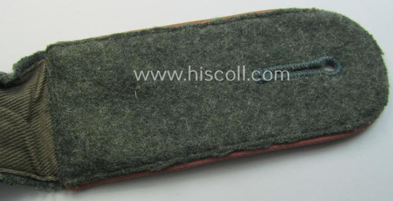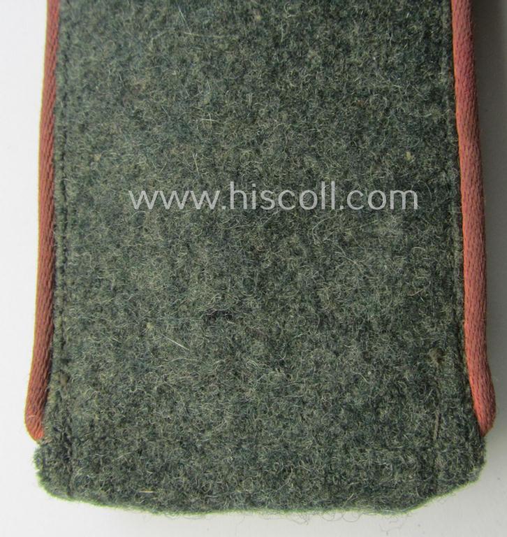 This is an attractive - albeit regrettably single but nevertheless scarcely seen! - (I deem) early- (ie. mid-war-) period, so-called: 'M40 o. M43'-pattern, WH (Heeres) enlisted-mens'-type shoulderstrap as was piped in the bright-pink- (ie. 'rosaroter'-) coloured branchcolour as was intended for a: 'Soldat u. Mitglied eines Panzer- o. Panzerjäger-Abteilungs o. Regiments' (or: simple soldier who served witin a tank-destroyer- ie anti-tank unit ie. regiment) and that comes in an overall nice- (I deem clearly issued- and/or: just moderately used- ie. worn-), condition. The shoulderstrap - which measures approximately 11,8 cms. in length as more often seen - has the woolen-type piping attached (as is more encountered with these early- (ie. mid-war-) period shoulderstraps). The shoulderstrap - which originates from a larger cloth- and insignia-collection I recently acquired for the web-site - comes mounted onto its functional tongue that shows a tiny ink-stamp on its inside (as can be noticed on the pictures). Simply an attractive - and/or fully 'text-book'! - 'M40- o. M43'-pattern, EM-type 'Panzer o. Panzerjäger'-related shoulderstrap that was intended for usage by a: 'Soldat u. Mitglied eines Panzer- o. Panzerjäger-Abteilungs o. Regiments'!