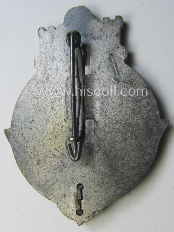 This is a very attractive - and actually very rarely encountered and truly luxuriously styled! - HJ- ie. BDM (ie. 'Hitlerjugend' or: 'Bund Deutscher Mädel') related, commemorative day-badge (ie. 'tinnie' ie. 'Veranstaltungsabzeichen') being a bright-silverish-toned- and light-weight, (I deem) zinc- ie. 'Feinzink'-based example as was issued to commemorate a specific (national!) youth-rally ie. gathering named the: 'Reichsberufs-Wettkampf der Deutschen Jugend' that was held in the year 1938 and that is entitled: 'Reichskampf Hamburg 1938' and that comes in an overall very nice- (albeit surely issued ie. moderately worn-), condition. The very detailed and/or pronounced badge truly shows extraordinary detail and was almost certainly never cleaned nor polished. The - as more often non-maker-marked - piece shows a detailed illustration of the Hamburg-based tower (ie. 'Hamburger Tor') and eagle-device (holding a so-called, enamelled: miniature 'HJ-Raute') with above that the years'-designation (1938) and (Gothic-styled) text as mentioned above. The badge comes naturally mounted onto its (functional and totally unaltered) pin-/catch set-up. Simply a very attractive - and with certainty rarely seen! - youth-related 'tinnie' ie. 'Veranstaltungsabzeichen' that is truly not that often offered for sale!