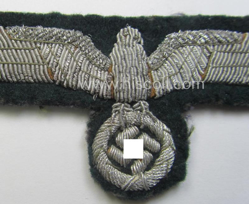 This is an attractive - and with certainty used and/or carefully tunic-removed! - example of a (fairly luxuriously-styled!) WH (Heeres) officers'-type, hand-embroidered- (and quite detailed!) army-type breast-eagle (ie. 'Brustadler für Offiziere des Heeres') being executed in bright-silverish-coloured braid on a darker-green-coloured- and/or 'smooth'-woolen-based background and that comes in an overall nice- (and as stated above carefully tunic-removed-), condition. This example - having a length ie. 'wingspan' of approximately 10,6 cms. - is nicely hand-embroidered using (bright) silverish-coloured 'braid' on a darker-green-coloured (and/or woolen-based-) background and does show some 'high-lighted'-areas as executed in bright-silver- (ie. darker-green) coloured thread ie. braid (as can be seen on the pictures). The eagle - which is void of a makers'-designation - does show minimal usage and wear as can be noticed on the pictures: it shows a neat additional 'backing' (made-out of bluish-toned- and linnen: moreover, does it show some clear stitching-remains (as can be seen on the pictures). Simply an attractive example of a WH (Heeres) officers'-type breast-eagle of the 'Extra Qualität' that is accordingly priced!