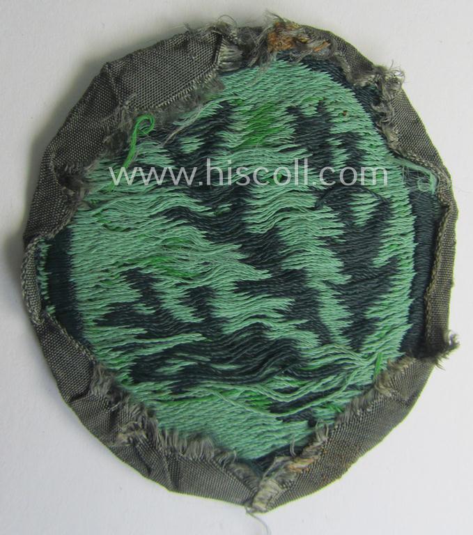Truly used- and/or worn, WH (Heeres) EM- (ie. NCO-) type, so-called: 'Jäger'-armpatch being a (typical) 'BeVo'-woven example as was executed on field-grey-coloured linnen as was intended for usage by the: 'Jäger-Truppen'