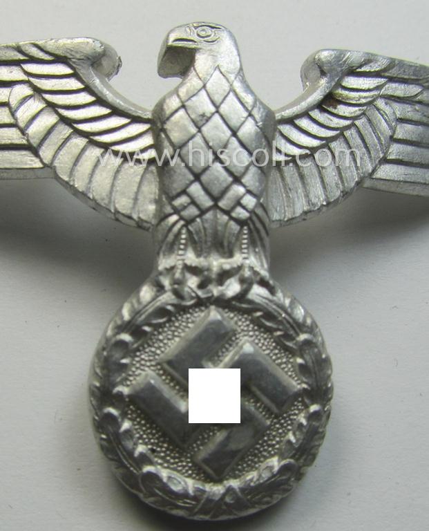 This is an attractive - and truly very detailed! - (bright) silverish-coloured- and typical alumnium-based, (political-style) visor- (ie. 'Schirmmützen'-) cap-eagle being a detailed example that is neatly: 'RzM - M1/111' marked on its back and that comes in an overall very nice- (ie. simply never worn- ie. still 'virtually mint- ie. unissued'-), condition. These cap-eagles were intended for usage on the visor-caps (ie. 'Schirmmützen') of one of the national-socialistic- (ie. party related-) organisations. The eagle has truly great pronounced detail and naturally retains all three, copper-toned pins ie. prongs in place (which were I deem never bent and which are of course still functional). On its back, the eagle is nicely marked with the makers'-designation: 'RzM - M1/111' as stated above. The piece - which is right-facing and that is having an approximate wing-span of 5,8 cms. - has most certainly never been cleaned nor polished: it is just a tiny bit tarnished caused by decades of storgae (as can be seen on the pictures). Of additional interest is, moreover, the fact that these eagles were occasionally also seen worn by Waffen-SS members. Simply an attractive and detailed 'party-style' visor-cap eagle: it will be very hard to upgrade this attractive, example!