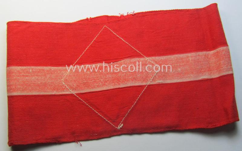 'Standard-issued'-pattern (ie. entirely woven) pattern, bright-red-coloured HJ- (ie. 'Hitlerjugend'-) related armband (ie. 'Armbinde') being a moderately worn- ie. used example that misses its 'RzM'-etiket