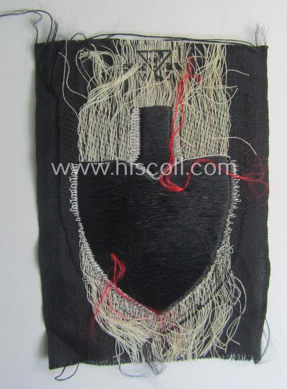 This is a very attractive - and actually very scarcely encountered! - officers'-type version of a so-called: RAD (ie. 'Reichsarbeitsdienst') sleeve-badge (or: 'Dienststellen-Abzeichen') bearing the specialist-designation: 'M' (as was intended for a senior RAD-official with the truly not that often seen function of: 'Hauptmeldebeamter' (or: senior-communications-official) and that comes in an overall nice- (ie. I deem probably issued- albeit simply never tunic-attached-), condition. These badges were worn on the upper-left sleeve of the mustard-coloured (officers'-type-) RAD-tunics and/or garments. The badge - which shows the red-coloured 'M'-character - is neatly executed in so-called 'flat-wire'-like-'BeVo'-weave technique. The piece was never folded nor trimmed and can be easily be graded as 'virtually mint' as to be expected. The badge is neatly maker-marked and displays the interwoven so-called: 'Ges.Gesch.'-designation as is more often found on RAD cloth badges- and/or insignia. This badge originates from a smaller collection of rarely seen RAD cloth-insignia I recently acquired for the web-site. It should be noted that all RAD officers'-type badges are comparatively scarcely encountered: those intended for specialised functions even more so!