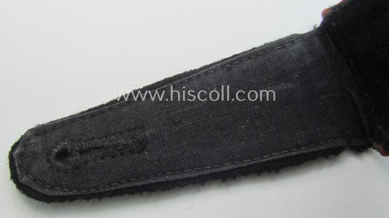 This truly attractive - and just moderately worn, albeit regrettably single! - WH (Heeres), NCO-type shoulderstrap (as was specifically intended to be used on the black-coloured, 'wrap-around'-styled Panzer-tunics) shows the neat bright-pink- (ie. 'rosaroter'-) coloured branchcolour and/or 'silk-like'-type piping attached and was as such worn by an NCO holding the rank of an: 'Unteroffizier u. Mitglied der Panzer-Truppen' (or: junior-sergeant who served within the tank-troops). The strap is in all facets a fully 'text-book' (and I deem early- ie. mid-war-period) NCO-strap and does show the minimal signs of having been used and/or worn as such. The shoulderstrap - that measures approx. 10,6 cms. sized in length as more often encountered - shows the (typical) silverish-yellow-toned NCO-braid period-attached and shows some moderate age simply caused by moderate wear and/or usage. The strap shows the regular-pattern tongue attached and shows a black-coloured underlay (as can be noticed on the pictures). It should be noted that these original, period 'wrap-around'-pattern, NCO-type shoulderstraps can nowadays easily be graded 'scarce': even more so when they are of the NCO-type and piped in the not that commonly encountered, bright-pink-coloured- (ie. 'Panzer-Truppen'-related-) branchcolour. I deem that this attractive and textbook WH (Heeres), NCO-type 'Panzer'-shoulderstrap is with certainty accordingly priced!